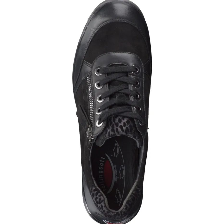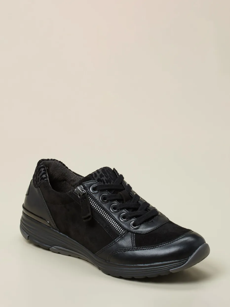Für stilvolle Beweglichkeit im Alltag.Gabor Comfort präsentiert diesen Komfort-Sneaker der Rollingsoft-Serie für Damen. Ob beim Stadtbummel oder im Café – der schwarze Sneaker überzeugt mit weich gepolstertem Fußbett und alltagstauglichem Design. Gefertigt aus hochwertigem Veloursleder, das sich mit samtiger Struktur zeigt und durch glänzende 3D-Leo-Details effektvoll akzentuiert wird. Die klassische, sportliche Silhouette bietet dank Schnürung und seitlichem Reißverschluss hohen Komfort bei gutem Sitz. Eine profilierte Gummisohle sorgt für Flexibilität und sicheres Auftreten. Ideal kombinierbar mit dunkler Denim oder minimalistischer Softshelljacke. Ein Gabor-Modell, das Tragekomfort und dezente Modestatements vereint.