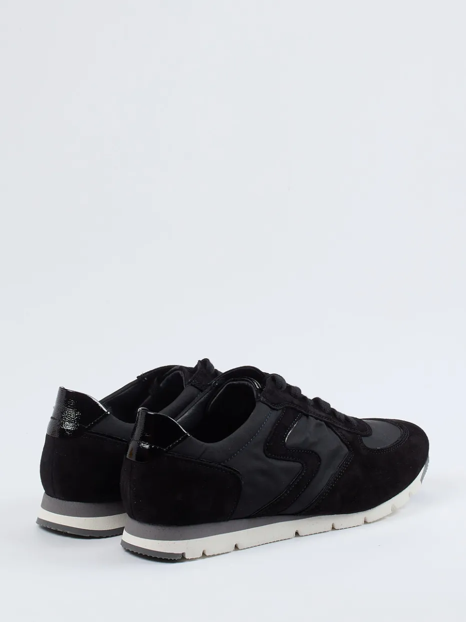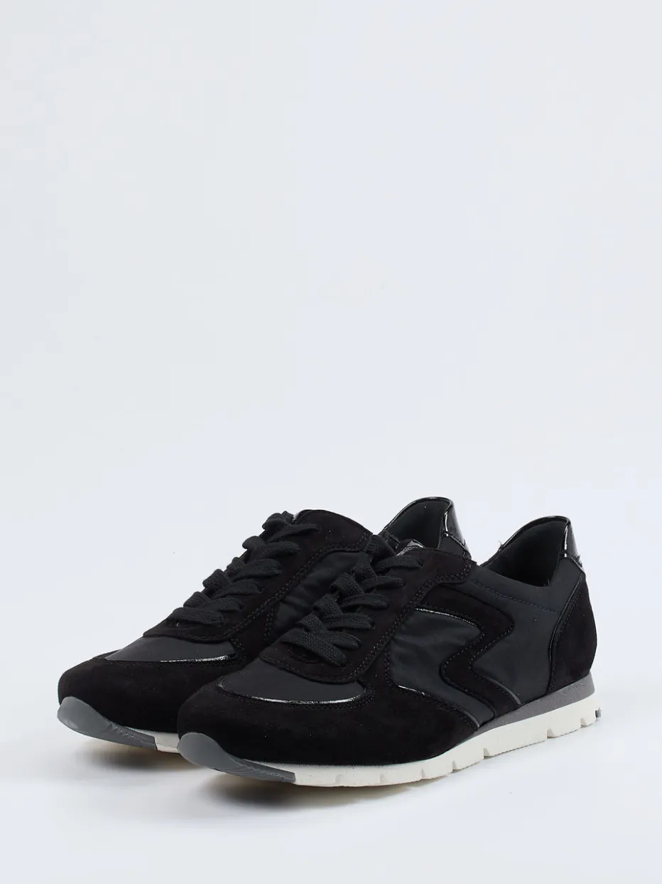 Schwarzes Veloursleder, samtig angeschliffen, trifft auf atmungsaktives Nylon – akzentuiert von glänzenden Lackleder-Einsätzen an Ferse und Zunge. Die flache Silhouette mit breiter Schnürung sorgt für angenehmen Halt, während die weiß-graue Gummisohle mit griffigem Profil sicheren Tritt vermittelt. Mit gepolstertem Wechselfußbett und Weite H ist dieser Low-Top ideal für komfortaffine Trägerinnen. Setzt sportive Akzente zu Jogpants, Stretch-Jeans oder monochromen Looks.