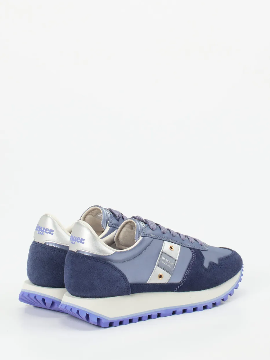 Retro-Statement in Lavendel und Dunkelblau.Blauer bringt mit diesem Sneaker Retro-Runner-Flair in die Streetwear. Wenn sportlicher Komfort auf trendiges Design trifft, entsteht ein Schuh wie dieser: Aus blauem Veloursleder gefertigt und samtig angeschliffen, kombiniert das Modell feinen Materialmix mit Textil und silberfarbenem Metallicleder an Ferse und Außenseite. Lavendel- und Dunkelblautöne erzeugen ein markantes Color-Blocking, das durch die flache Silhouette und das klassische Schnürsystem unterstrichen wird. Die stark profilierte Gummisohle bietet optimalen Grip und rundet den Look funktional ab. Ideal zu Jogpants oder lässigen City-Outfits. Ein Sneaker mit Stilbewusstsein und urbaner Alltagskompetenz.