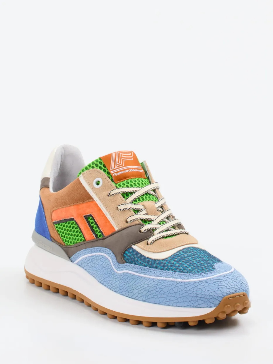 Ein Statement für stilbewusste Individualisten.Die Marke Floris van Bommel zeigt mit diesem Sneaker für Herren einen markanten Vertreter moderner Retro-Runner. Das Modell verbindet samtiges Veloursleder mit genarbten und meshartigen Texturen. Der mehrfarbige Materialmix in Hellblau, Grün und Orange unterstreicht durch gezieltes Color-Blocking den aktuellen Y2K-Trend. Die klassische Runner-Silhouette mit gepolstertem Schaft, profilierter Gummisohle und Schnürung sorgt für Tragekomfort und Stilkompetenz. Als Streetwear-Highlight eignet sich der Schuh ideal für Freizeit und stilvolle Casual-Looks. Unkonventionelles Design mit hohem Wiedererkennungswert – typisch Floris van Bommel.