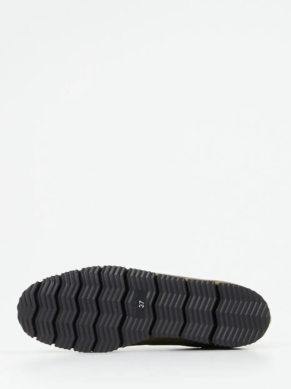 Understatement trifft trendige Akzente.Der Damen-Sneaker von Konstantin Starke kombiniert dezente Eleganz mit progressivem Design. Ideal für urbane Alltagswege überzeugt das Modell mit olivgrünem Veloursleder, samtig angeschliffen, und einer auffälligen, hochglänzenden Metallic-Fersenkappe in Bronze. Die filigrane Zickzack-Naht und die tonige Filz-Schnürung verstärken den minimalistisch-sportiven Charakter. Die flache, flexible Leichtzellsohle unterstützt den Tragekomfort, während Retro Runner-Elemente das Design subtil verankern. Perfekt zu monochromen Office-Looks oder casual Denim-Kombinationen. Ein subtil-exklusives Modell, das Komfort und modische Prägnanz souverän vereint.