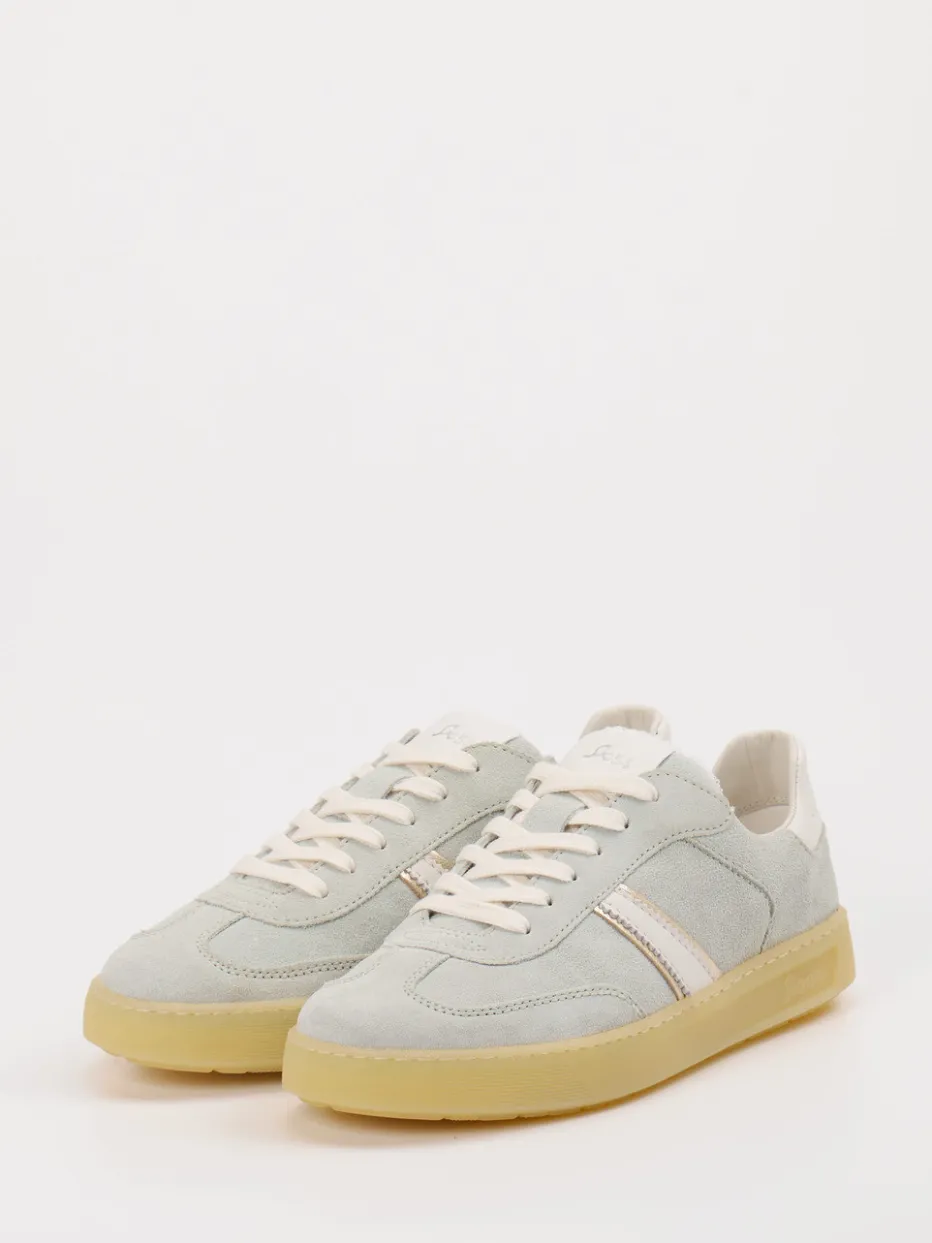 Perfekt für entspannte City-Tage überzeugt der Low-Top-Sneaker mit pastellgrünem Veloursleder und mattem Finish. Weiße Kontraststreifen mit feinem Metallic-Detail setzen ein dezentes Highlight. Die flache Silhouette und der gepolsterte Fersenbereich sorgen in Kombination mit der flexiblen Gummisohle für angenehmen Laufkomfort. Der Retro-Sportswear-Einfluss des Designs harmoniert mit dem angesagten Soft-Neutrals-Trend. Besonders stimmig wirkt er zu luftigen Chinos oder minimalistischen Alltagslooks.