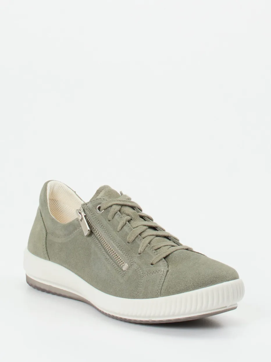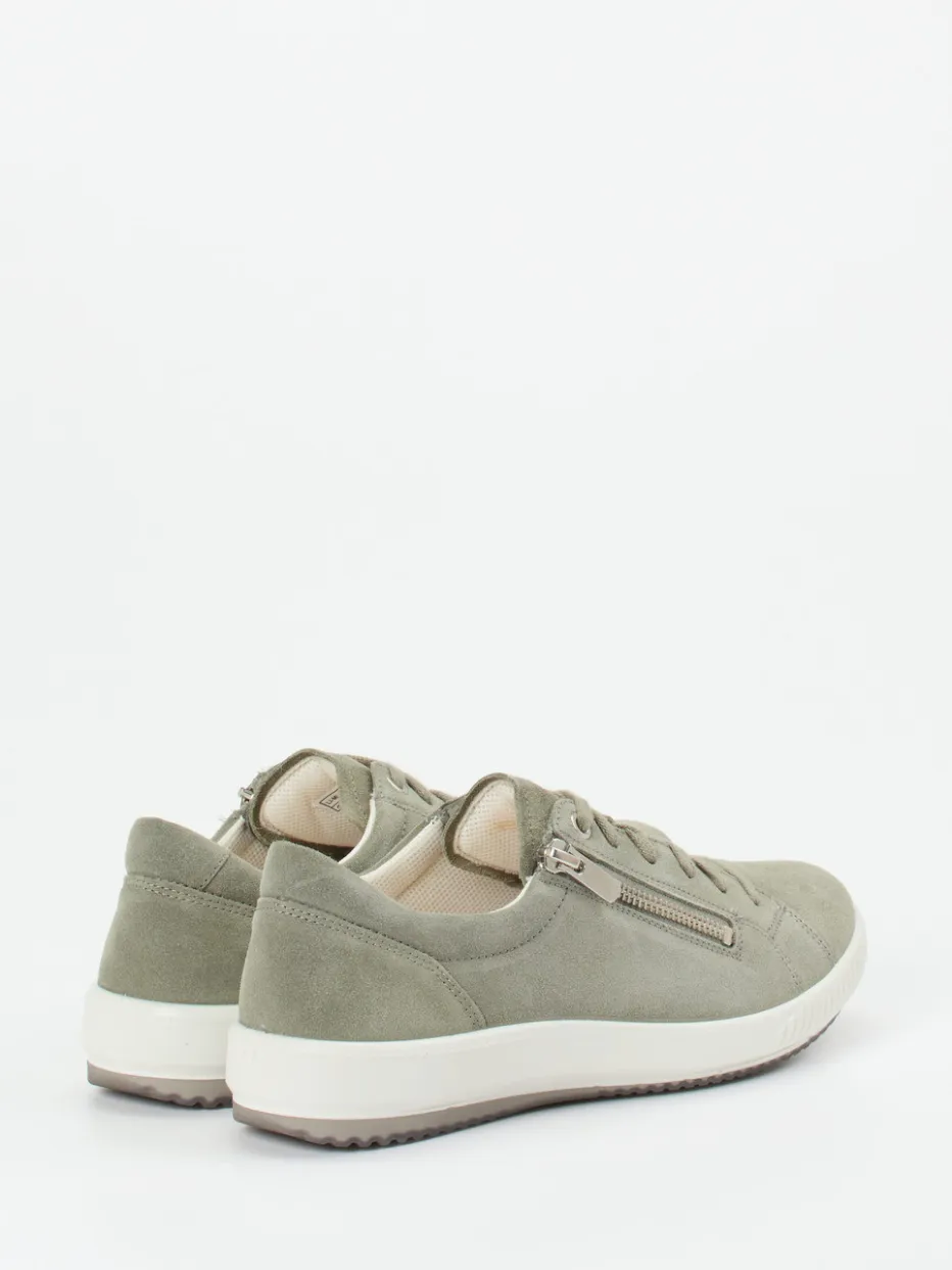 Unaufgeregter Stil für entspannte Tage.Dieser Damen-Sneaker von Legero überzeugt als smarter Alltagsbegleiter. In salbeigrünem Veloursleder mit samtiger Haptik gestaltet, fällt das Modell durch seine klassisch-runde Form sowie den funktionalen Reißverschluss neben der Schnürung auf. Ein angenehm gepolsterter Einstieg und das atmungsaktive Hightech-Mesh-Futter tragen zum hohen Tragekomfort bei. Die flexible Gummisohle unterstützt lässiges Gehen – ideal in Freizeit und urbaner Casualwear. Minimalistische Ton-in-Ton-Nähte und das zurückhaltende Design fügen sich stilvoll in die Soft-Neutrals-Trendwelt der Saison ein. Harmoniert ausgezeichnet mit leichten Naturtönen. Legero steht hier für entspannten Komfort in zeitgemäßer Optik.