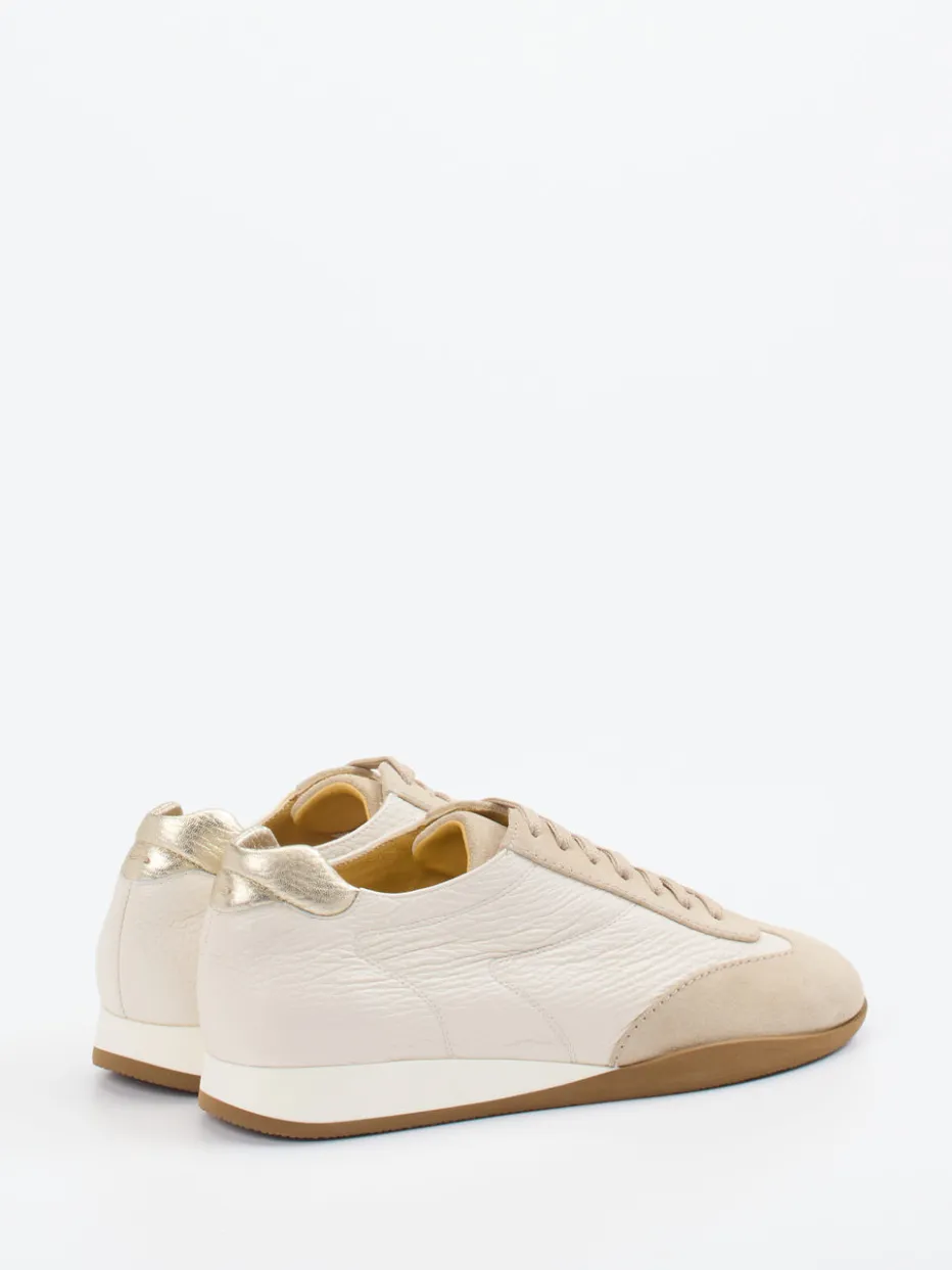 Eleganter Retro-Stil für moderne Looks.Die Marke Truman’s präsentiert mit diesem Sneaker ein feminines Modell für stilbewusste Casual-Kombinationen. Cremige Beige- und Sandtöne treffen hier auf hochwertiges Veloursleder mit samtiger Haptik und natürlich genarbtes Glattleder. Der leicht keilförmige Aufbau und die gepolsterte Innenverarbeitung sorgen für gehobenen Tragekomfort. Eine goldfarbene Fersenkappe sowie die zweifarbige Gummisohle setzen dezente Designzeichen. Inspiriert von 90er-Jahre-Retro-Ästhetik fügt sich das Modell ideal in entspannte Looks ein und trifft den „Quiet Luxury“-Trend. Luxuriöses Understatement – stilecht interpretiert von Truman’s.