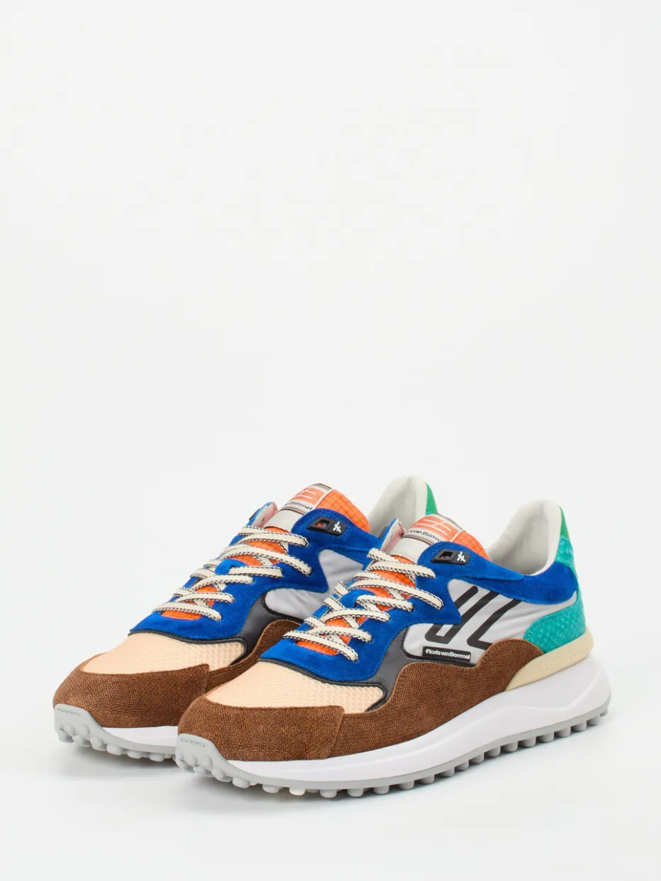 Streetstyle mit Charakter.Der Herren-Sneaker von Floris van Bommel verbindet zeitgemäßes Design mit sportlichem Komfort. Ideal bei urbanen Freizeitaktivitäten setzt dieses Modell auf einen ausdrucksstarken Materialmix. Veloursleder kombiniert mit Nylon, Textil und Druckleder ergibt eine vielfältige Struktur mit samtigen, glatten und genarbten Oberflächen. Die Farbpalette beeindruckt mit Mittelbraun als Basis, akzentuiert durch Kobaltblau und Türkisgrün in reflektierenden Kontrasten. Die klassische, sportliche Silhouette, gepolsterte Zunge und die profilierte EVA-Noppensohle unterstreichen Funktionalität und Tragekomfort. Als Streetwear-Highlight harmoniert der Sneaker mit Jogpants, Denim oder kurzen Hosen. Individueller Stil und bequeme Alltagstauglichkeit – typisch Floris van Bommel.