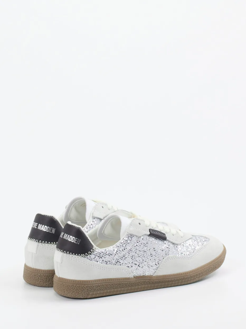 Glitter-Style mit Retro-Vibe.Die Marke Steve Madden zeigt mit diesem Damen-Sneaker ein Modell, das Komfort und Trendgespür vereint. Ob City-Walk oder Abendveranstaltung – das Design passt zu jeder Gelegenheit. Gefertigt aus grauem Veloursleder und glänzendem Metallictextil mit Glitzereffekt, überzeugt der Sneaker in einer klassischen, flachen Silhouette. Der Kontrastbesatz mit Logo an der Ferse verleiht zusätzliches Stilprofil, während die rutschhemmende Gummisohle für sicheren Halt sorgt. Streetwear-inspiriert mit Anleihen aus der Y2K-Ästhetik, passt er zu Metallic-Accessoires und Oversized-Fashion. Steve Madden steht hier für modische Extravaganz bei maximalem Tragekomfort.
