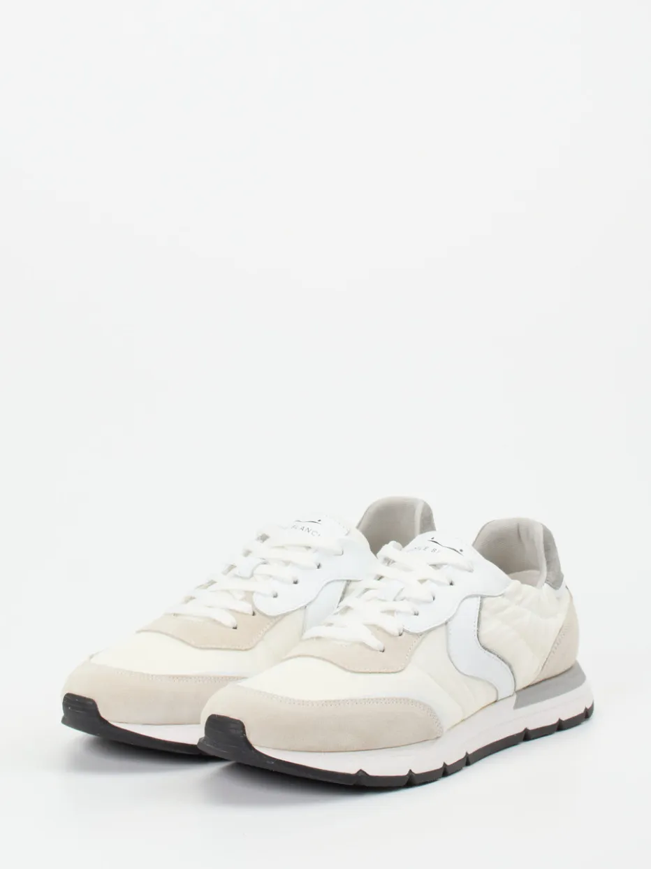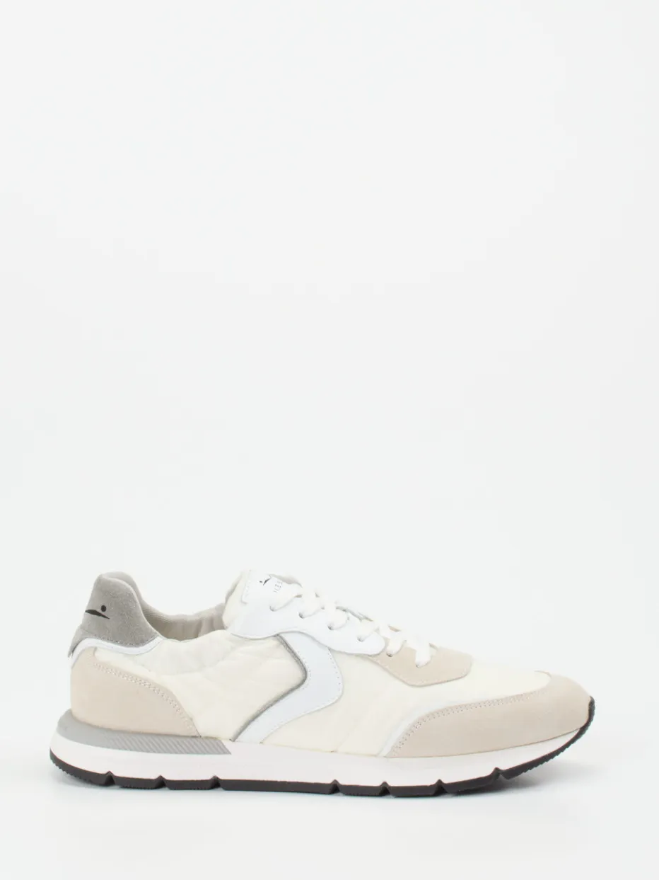 Moderner Klassiker mit Retro-Charme.Voile Blanche präsentiert hier einen puristisch-eleganten Low-Top-Sneaker. Ideal für entspannte Stadtspaziergänge oder als stilvoller Begleiter auf Reisen überzeugt das Modell mit einer Kombination aus samtigem Veloursleder und strukturiertem Textil. Der Ton-in-Ton gehaltene Offwhite-Look wird durch hellgraue Lederdetails abgerundet. Die klassische, schmale Silhouette, die gepolsterte Ferse und das weich lederbezogene Innenfutter sorgen für hohen Alltagskomfort. Funktionale Details wie die stabile Gummisohle mit markanter Profilierung machen ihn rundum alltagstauglich. Geprägt vom Retro-Running-Stil fügt er sich harmonisch in die „Quiet Luxury“-Ästhetik ein. Ein stilischer Essential mit hohem Tragekomfort von Voile Blanche.