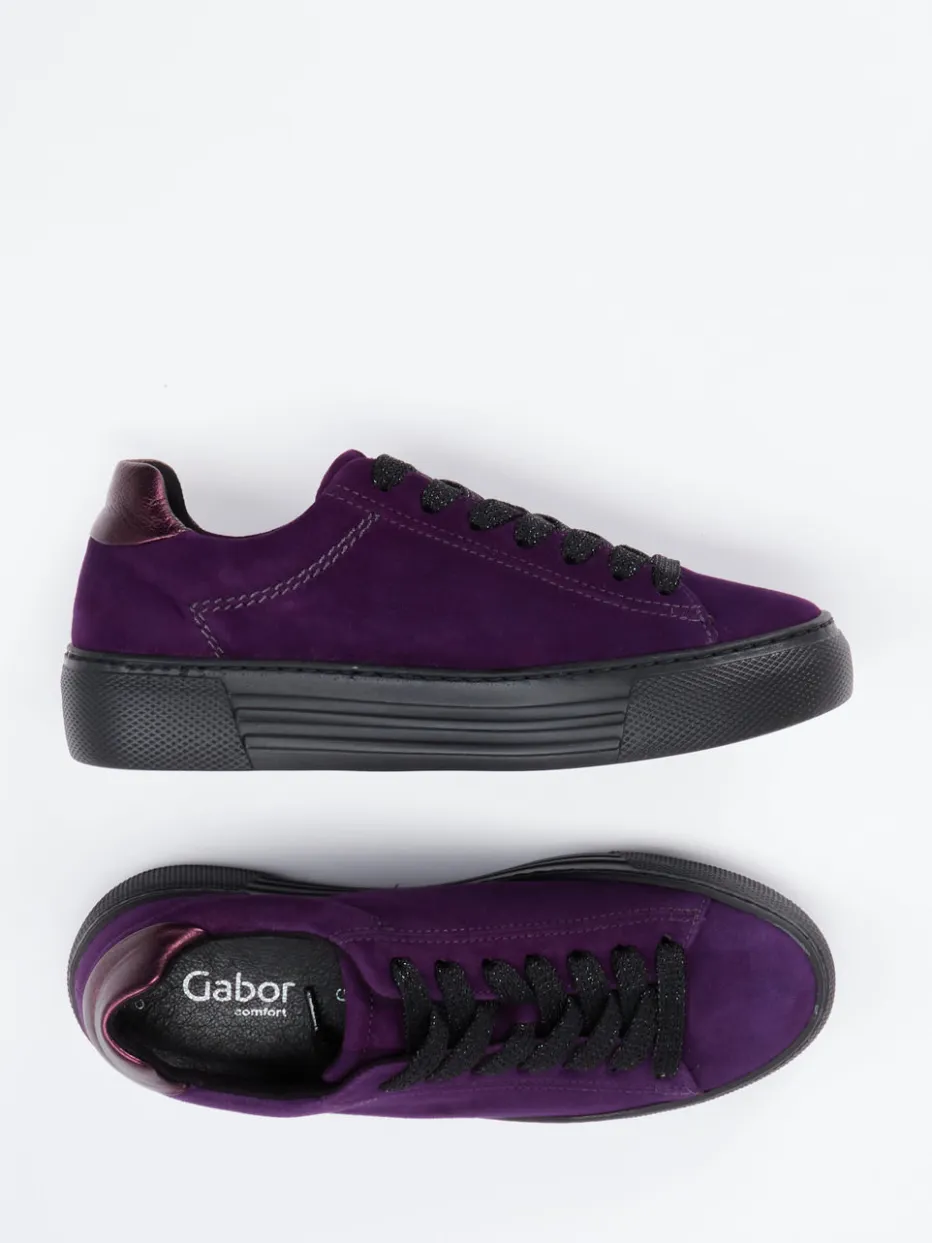 Violetter Akzent im minimalistischen Look.Gabor Comfort präsentiert einen Damen-Sneaker, der Stil und Tragekomfort vereint. Ideal für entspannte Alltagsmomente bietet dieses Modell ein violettes Veloursleder mit samtiger Oberfläche und metallic-brombeerfarbenem Fersenabschluss. Die klassisch abgerundete Silhouette wird durch glitzernde Schnürsenkel und eine graue Plateausohle akzentuiert, deren profilierte Gummibasis für Trittsicherheit sorgt. Ein weich gepolstertes, herausnehmbares Fußbett ergänzt den Gehkomfort. Inspiriert von modernem Minimalismus bringt das Design einen ruhigen, aber auffälligen Farbtwist in Streetwear-Looks. Ein stilvoller Komfortschuh, gefertigt für lässige Stunden mit Charakter.