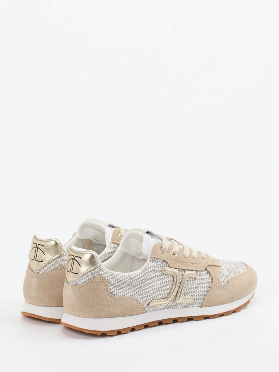 Sommerlicher Style mit Retro-Charakter.Der Damen-Sneaker von Candice Cooper verbindet modische Zurückhaltung mit funktionalem Design. Ideal für leichte Sommer-Outfits in der Freizeit überzeugt das Modell mit einer hochwertigen Materialkombination aus beigem Veloursleder und meshartigem Nylon. Goldfarbene Lederpatches und ein glänzender Fersenbesatz setzen dezente Akzente, während die flache Silhouette und die profilierte, honigfarbene Gummisohle Komfort bei jedem Schritt bieten. Die Schnürung sorgt dabei für sicheren Halt. Die cleanen Linien und metallic Nuancen spiegeln aktuelle Trendthemen wie Quiet Luxury wider und lassen sich ausgezeichnet mit natürlichen Tönen wie Leinenweiß oder Sand stylen. Ein sommerlicher Sneaker mit italienischer Note und liebevollen Details.