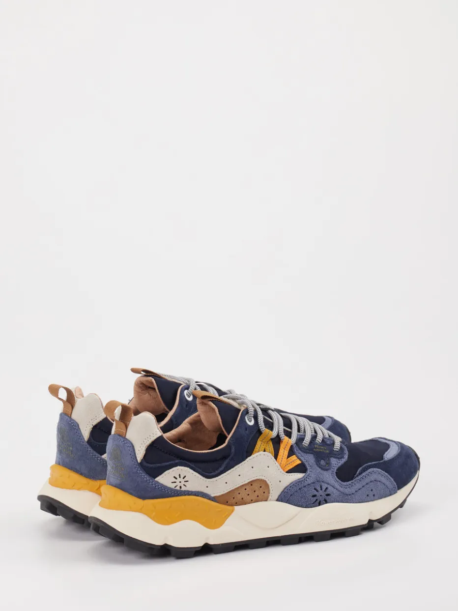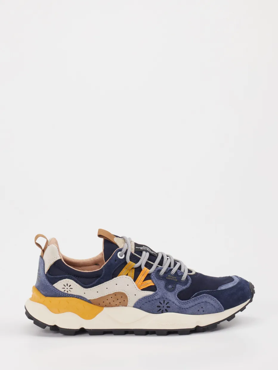 Funktional auffallen mit Stil. Flower Mountain präsentiert mit diesem Sneaker ein modisches Statement zwischen Streetstyle und Outdoor-Nähe. Für urbane Streifzüge oder entspannte Wochenendtrips vereint das Modell eine robuste Gummisohle mit ergonomischer Silhouette. Das Außenmaterial in Veloursleder wird durch textile Partien und reflektierende Schnürsenkel ergänzt, während kräftige Blautöne mit senfgelben und cremeweißen Akzenten ein dynamisches Color-Blocking ergibt. Zuglaschen an Zunge und Ferse sowie das nachhaltige Innenfutter mit Korkanteil runden den Funktionsanspruch ab. Als Trendschuh im Gorpcore-Stil lässt sich das Paar vielfältig zu sportlich-lässigen Outfits kombinieren. Markentypisch zeigt sich Flower Mountain experimentierfreudig, modisch mutig und designorientiert.