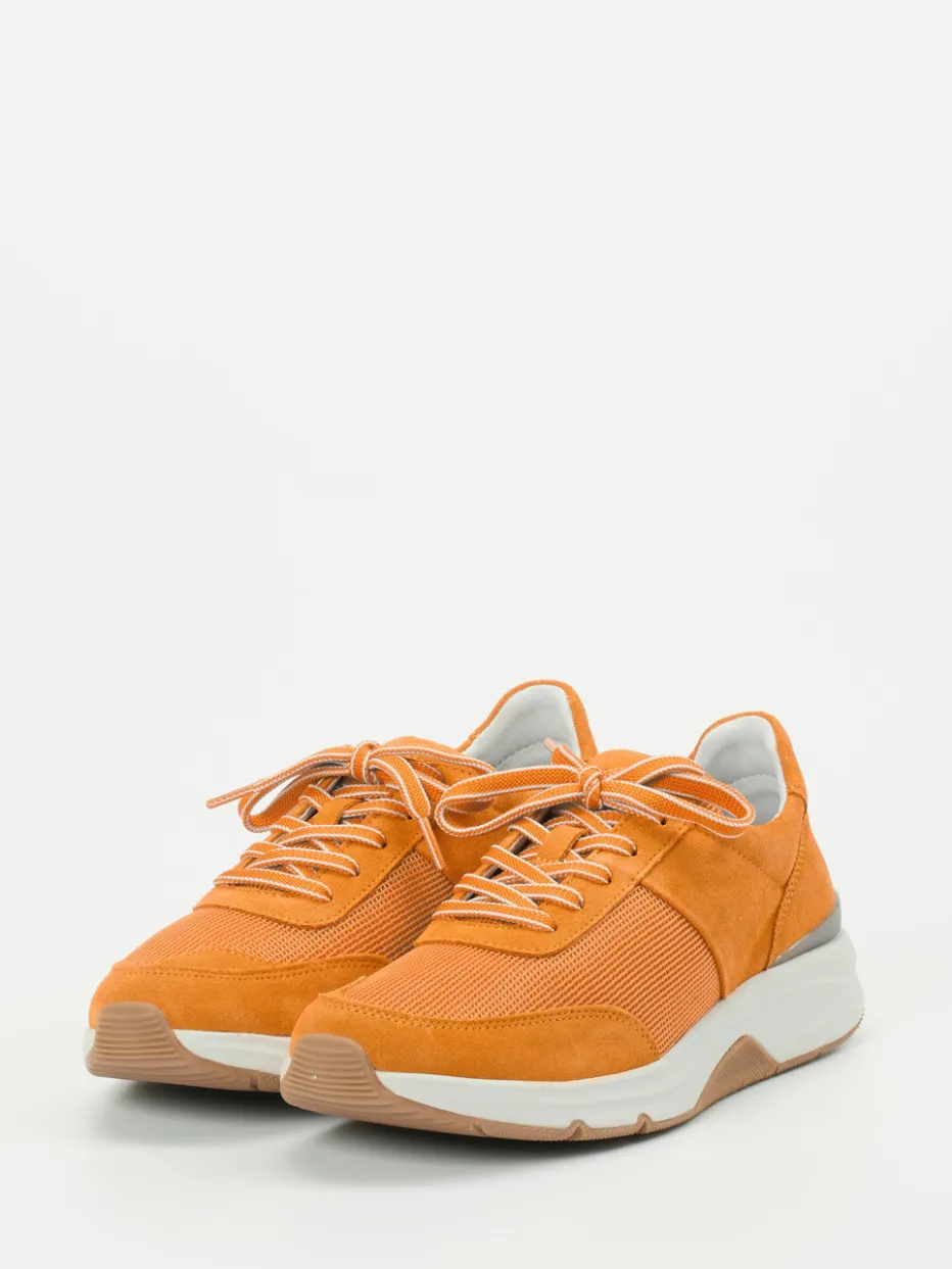 Farbstark und komfortorientiert.Gabor Comfort bietet mit diesem Damen-Sneaker eine stilvolle Option für den aktiven Alltag. Ob beim Stadtbummel oder bei entspannten Wochenendplänen – der Sneaker überzeugt durch softes Veloursleder, samtig angeschliffen, kombiniert mit atmungsaktivem Mesh. Das dominierende Orange wird mit hellgrauen und braunen Akzenten inszeniert. Die sportlich-voluminöse Form, gepolsterte Einstiege und eine profilierte Gummisohle mit ‚rollingsoft‘-Wechselfußbett unterstreichen den Tragekomfort. Ton-in-Ton-Nähte, zweifarbige Schnürsenkel und dezente Logo-Akzente setzen stilvolle Details. Der Look passt ideal zu Casualwear-Trends oder Color-Blocking-Styling. Maximal bequemer Sneaker mit funktionalem Anspruch und modischem Charakter.