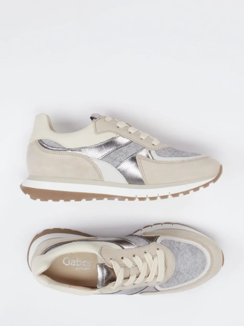 Sportiver Chic mit Metallic-Akzent.Gabor Comfort bringt mit diesem Damen-Sneaker eine stilvolle Verbindung aus Retro-Running-Stil und modernem Komfort. Für entspannte Stunden in Freizeit oder Alltag bietet der bequeme Sneaker dank profilierter Gummisohle zuverlässigen Halt. Das Obermaterial vereint samtig angeschliffenes Veloursleder mit strukturiertem Textil und silbernen Metallic-Einsätzen. Beige dominiert den Look, unterstützt von dezenten Graunuancen und klarer Linienführung. Die klassische, flache Silhouette mit gepolstertem Rand und praktischer Schnürung akzentuiert das sportlich-relaxte Design. Ein herausnehmbares Wechselfußbett rundet das Tragegefühl komfortbetont ab. Ideal auch zum Soft-Neutrals-Trend. Gabor Comfort bietet Stil und ergonomische Leichtigkeit mit durchdachtem Materialmix.