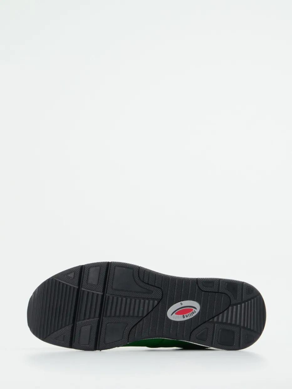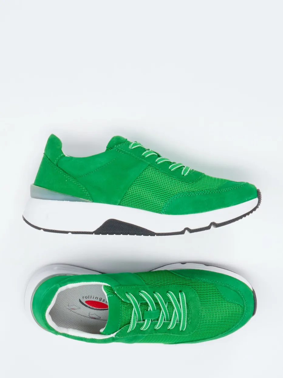 Frischer Kick für sportlich-entspannte Outfits.Gabor Comfort präsentiert einen bequemen Low-Top-Sneaker für Alltag und Freizeit. Ideal für aktive Stunden im urbanen Raum überzeugt das Modell durch einen gelungenen Materialmix aus grünem Veloursleder und strukturiertem Mesh. Die sportlich-kompakte Form wird durch Ton-in-Ton-Nähte, zweifarbige Schnürung und eine weiß-schwarze Gummisohle unterstrichen. Ein gepolsterter Schaftrand und das rollingsoft Wechselfußbett garantieren angenehmen Tragekomfort. Farblich ist der Sneaker ein Highlight für Monochrome Looks mit Color-Pop-Akzent in der Frühjahr/Sommer-Saison. Lässt sich vielseitig mit leichten Windjacken und modernen Funktionsstoffen kombinieren. Maximierter Komfort trifft auf souveränen Streetwear-Stil von Gabor Comfort.