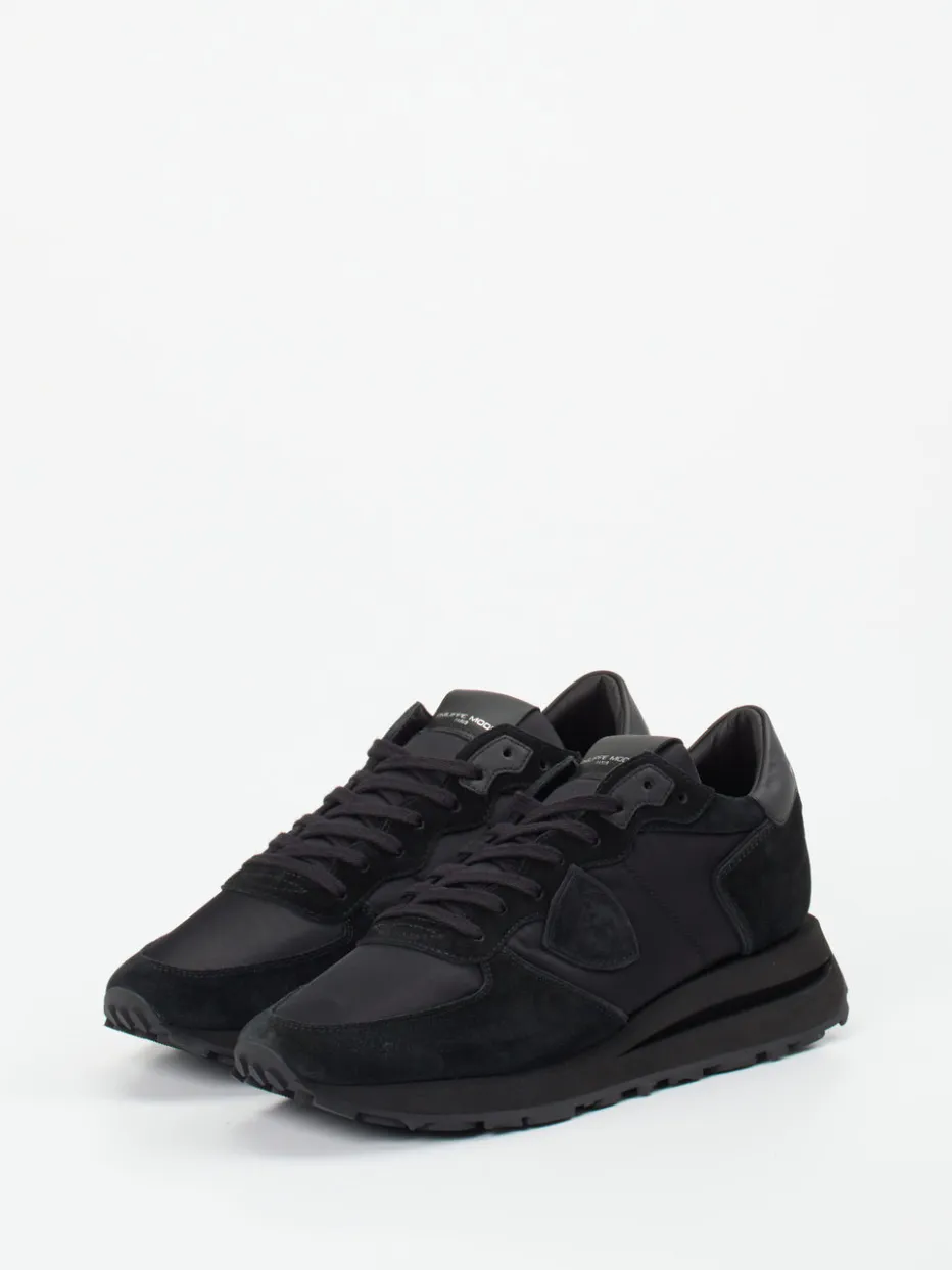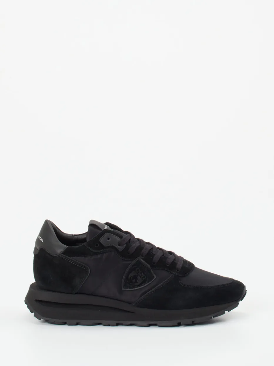 Der All-Black-Sneaker von Philippe Model kombiniert edles Veloursleder mit sportlichem Nylon in Retro-Laufstil. Ein stilvoller Begleiter für urbane Alltagslooks.