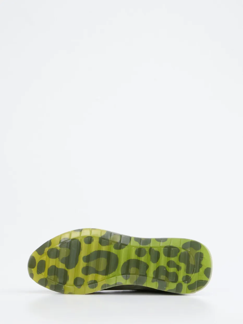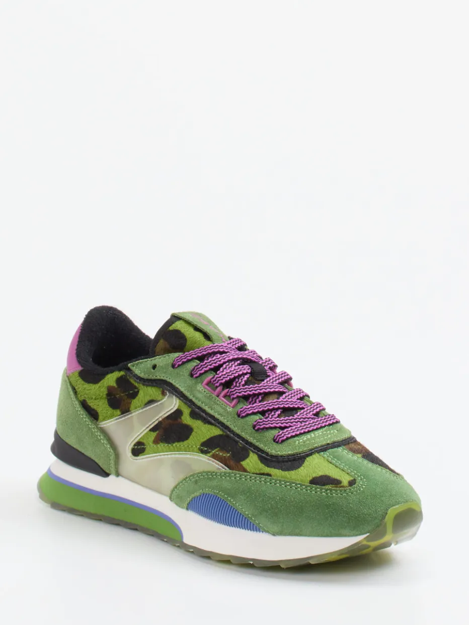 Extravagantes Design trifft Alltagstauglichkeit.THE HOFF BRAND liefert mit diesem Low-Top Sneaker ein markantes Modell für urbane Style-Statements. Ob für die City oder angesagte Events – das Modell überzeugt mit Veloursleder, samtig angeschliffen, kombiniert mit Textil in tierisch-gefärbter Felloptik. Die grasgrüne Grundfarbe wird von violett-schwarzen Schnürsenkeln und transparenten Seitenelementen akzentuiert. Ein gepolsterter Schaft und das frotteeweiche Innenfutter sorgen für Tragekomfort, während die mehrfarbige Gummisohle sicheren Halt bietet. Die Silhouette erinnert an Retro-Running-Stile und greift aktuelle Color-Blocking- sowie Animal-Print-Trends auf. Ein Unisex-Sneaker mit Eyecatcher-Faktor und klarer Streetstyle-Attitüde.