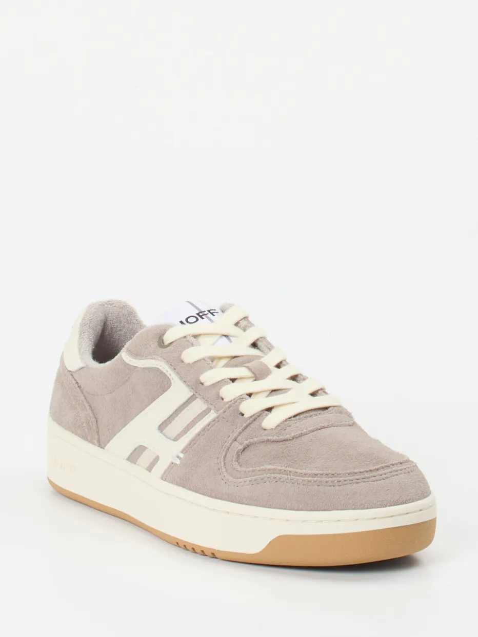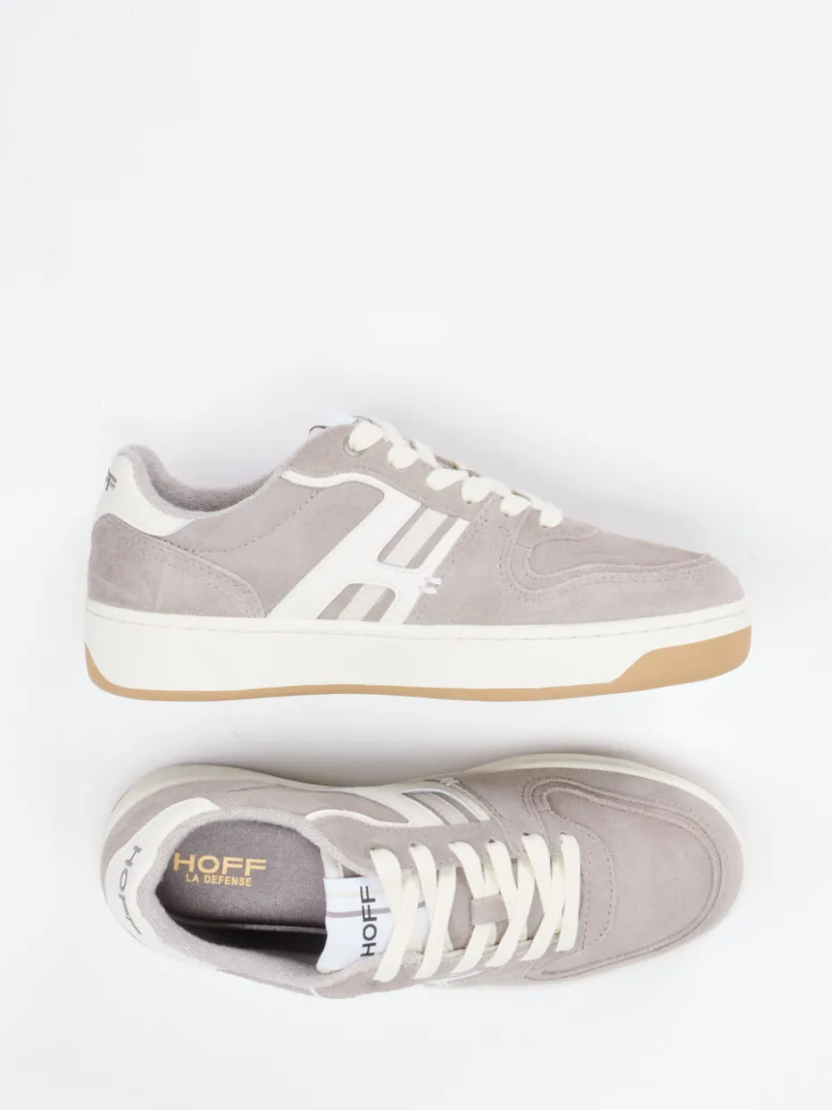 Retro trifft Komfort im Alltag.THE HOFF BRAND präsentiert mit diesem Sneaker ein Modell der Low-Top-Kategorie mit urbanem Charakter. Ideal für entspannte Freizeitlooks bringt der Schuh eine Kombination aus grauem Veloursleder mit samtig matter Oberfläche und Textildetails in Cremeweiß und Beige. Die klassisch abgerundete Silhouette harmoniert mit Ton-in-Ton-Nähten und seitlichem Logo-Overlay, während Schnürung und Logoprints auf Zunge und Ferse markentypische Akzente setzen. Die gepolsterte Innensohle mit Memory Foam sowie das atmungsaktive Innenfutter sorgen für hohen Tragekomfort, die rutschhemmende Gummisohle mit dezent buntem Profil bietet zusätzliche Alltagstauglichkeit. Passend zum Trend „90s Revival“ bringt dieses Modell Streetwear-Attitüde in jedes Outfit. Ein modisches Statement für stilbewusste Bewegung mit Markenprofil.