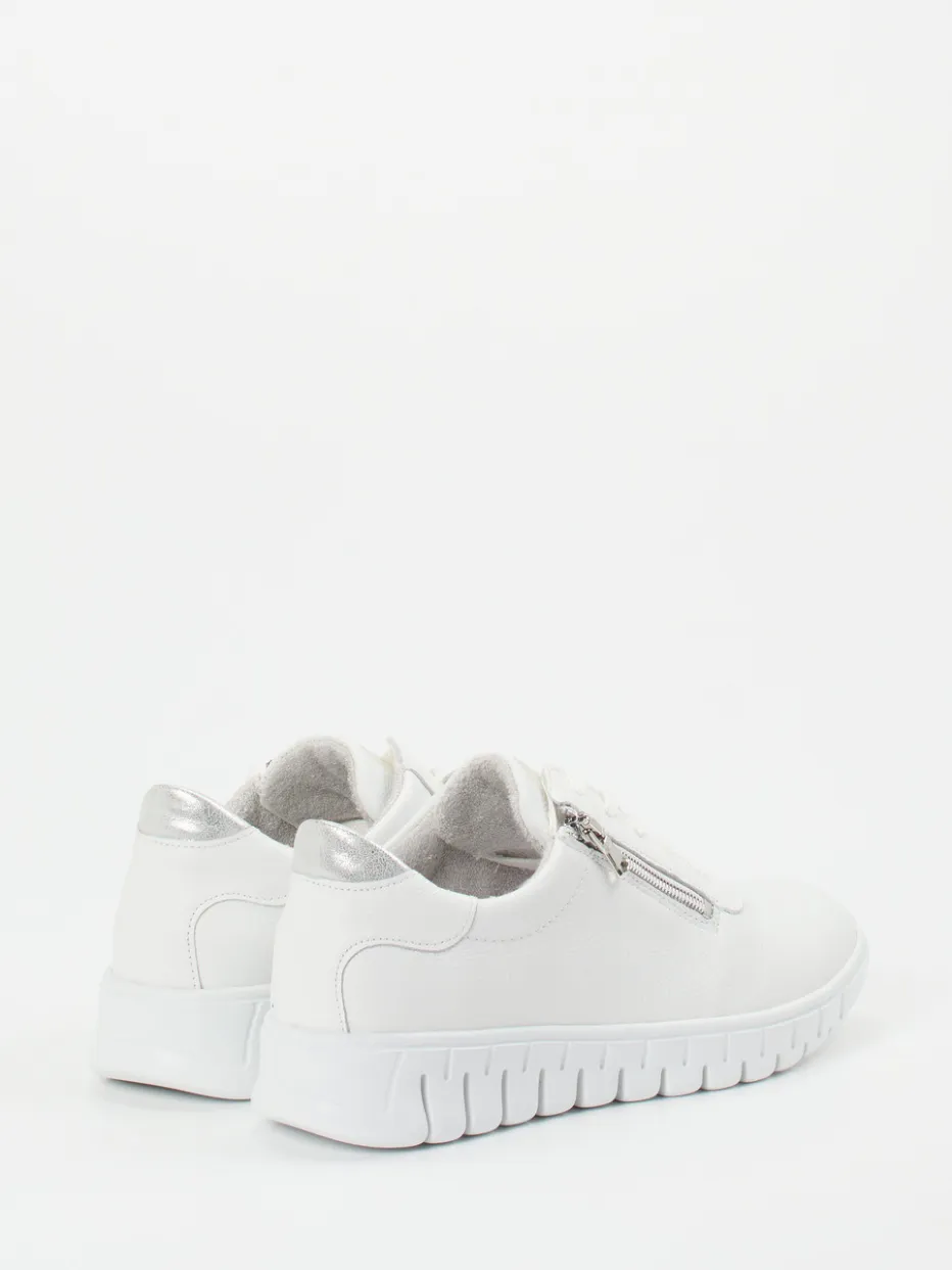 Modisch präsentiert die Marke Waldläufer diesen Sneaker in der Form Birdy mit der Weite H. Das weiße Kalbleder wirkt durch die natürliche Narbung besonders sportiv. Ist die tonige Schnürung einmal individuell eingestellt, hilft der seitliche Reißverschluss beim einfachen Ein- und Ausstieg. Die wunderbar weiche Innenpolsterung, das saugfähige Frottee und das gepolsterte Wechselfußbett versprechen besten Tragekomfort. Die gut profilierte, angenehm leichte EVA-Sohle sorgt für Trittsicherheit.