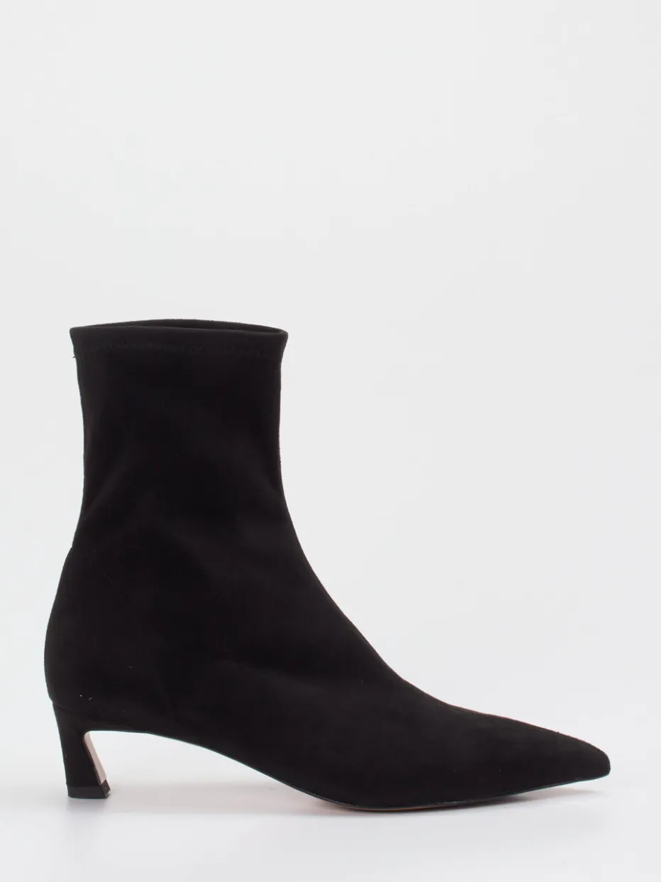 Minimalismus trifft Retro-Eleganz.Die Marke Konstantin Starke präsentiert eine feminine Stiefelette mit moderner Sock-Boot-Silhouette. Ideal für stilvolle Tage im Büro oder elegante Abendveranstaltungen: Das schwarze Stretchmaterial liegt angenehm am Bein an und erhält durch samtig mattes Finish eine wertige Wirkung. Dank der spitz zulaufenden Form und dem 4,5 cm hohen Kitten Heel ergibt sich ein femininer Look mit komfortabler Laufhöhe. Ton-in-Ton-Nähte und eine schlanke Passform unterstreichen den edlen Quiet-Luxury-Stil. Perfekt kombiniert zu feinmaschigem Rollkragenpullover und Midirock für einen eleganten Auftritt. Zeitloser Chic mit dezenter Trendnote in markentypischer Qualität.