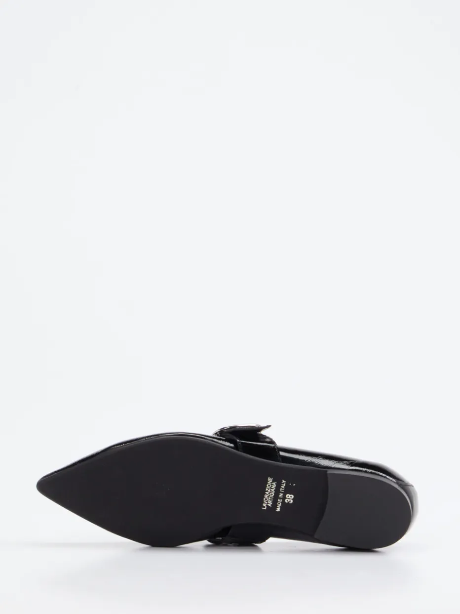 Ein spitz geschnittener Ballerina mit glänzendem Finish und Punk-Elementen. Die markanten Schnallen- und Ösendetails setzen starke Akzente im minimalistischen Look.