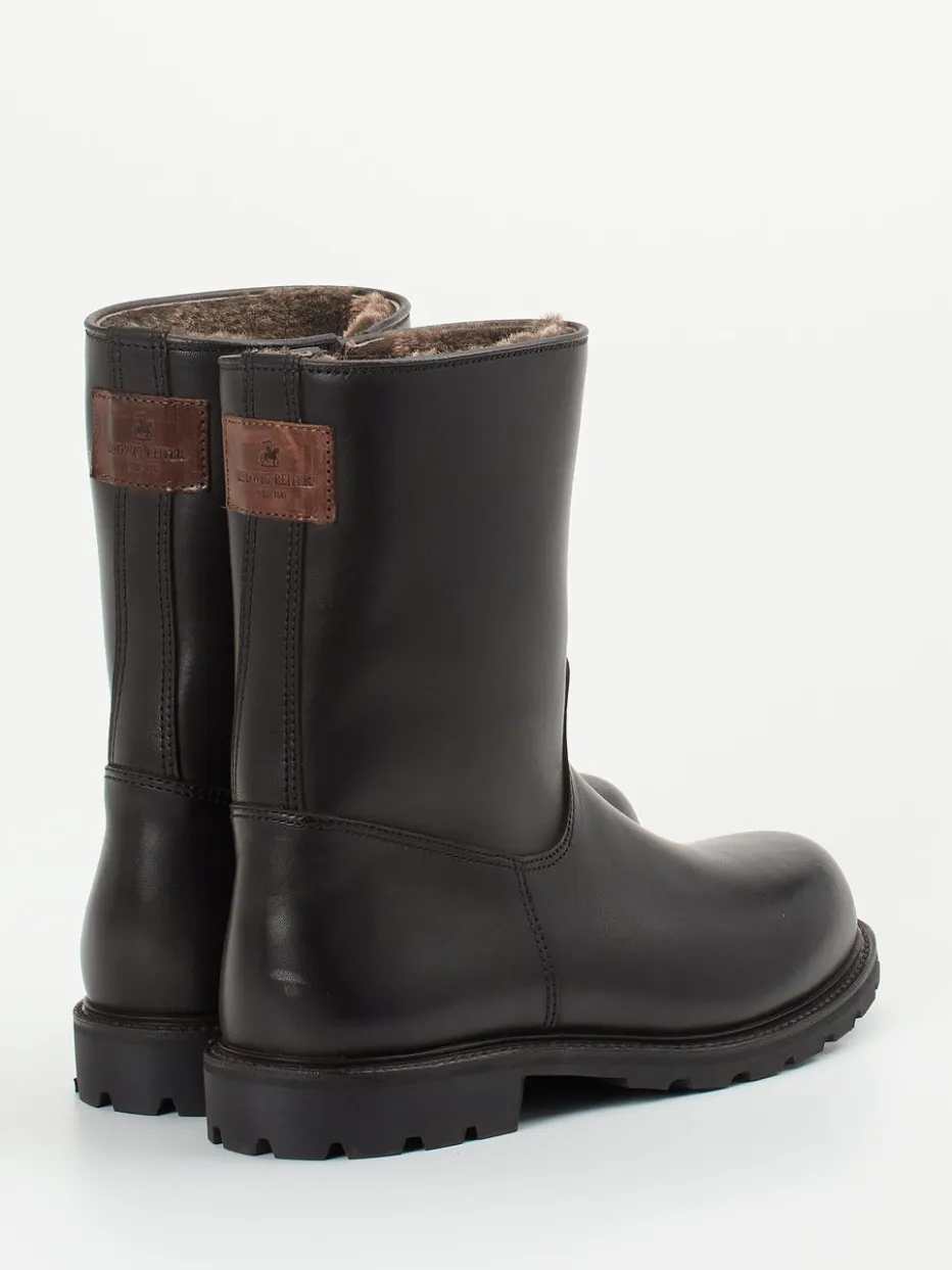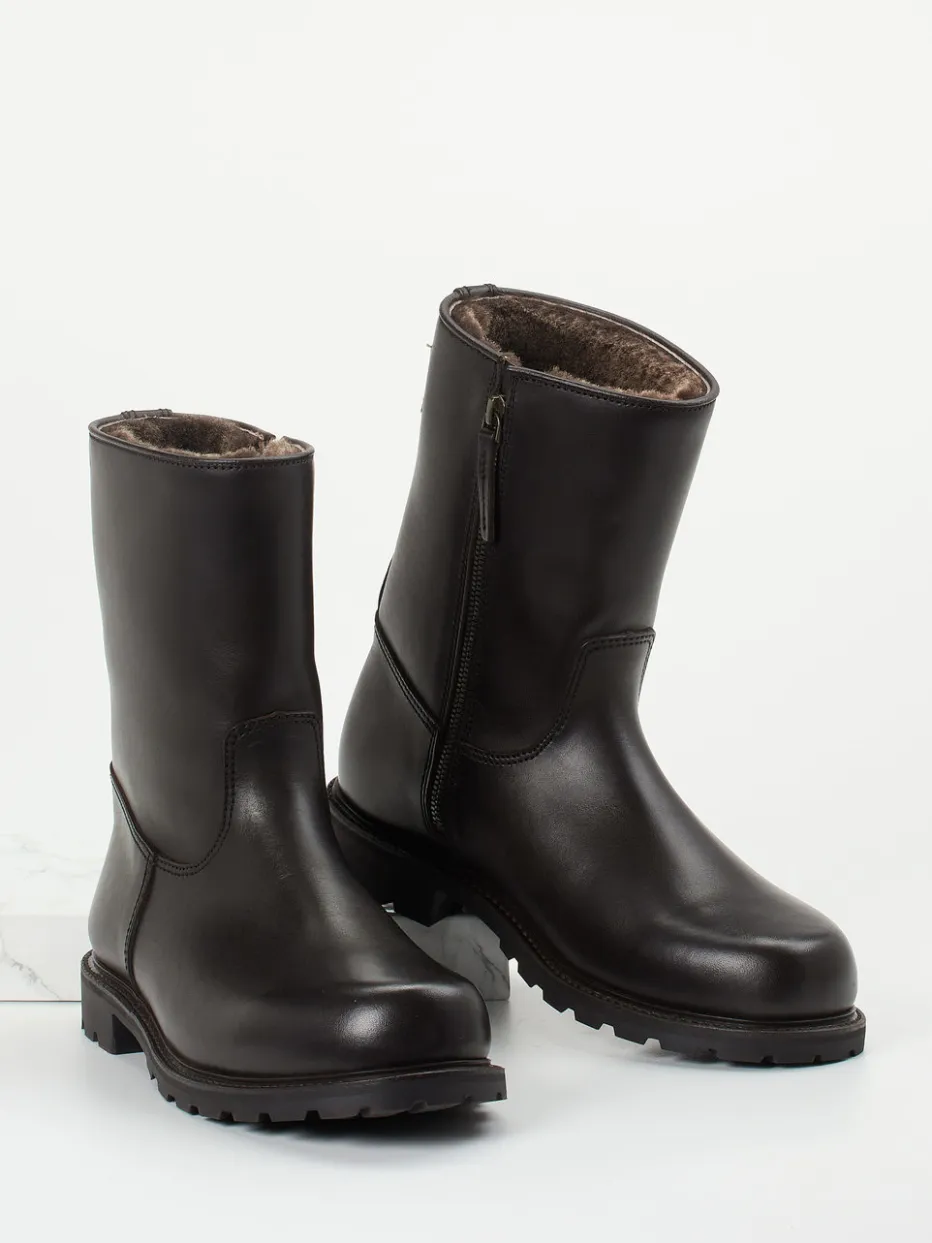Wenn Kälte und Nässe dominieren, überzeugt dieses Modell mit wetterfestem Fettleder, matt samtiger Oberfläche und flauschigem Lammfellfutter. Der tiefe Braunton unterstreicht die klare Silhouette mit geradem Schaft und tonigem Reißverschluss an der Innenseite. Die profilierte Gummisohle sorgt für stabilen Halt auf winterlichen Untergründen. Abgerundet wird das Design durch feine Ton-in-Ton-Nähte und ein geprägtes Markenlogo am Hinterriemen. Im Stil zwischen Workwear und dezentem Luxus positioniert, lässt sich der Stiefel vielseitig zu Wollmantel oder Denim kombinieren.