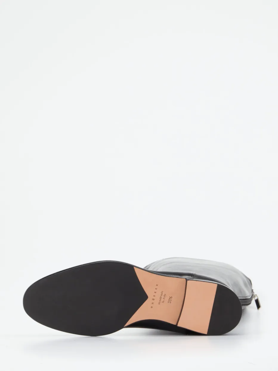 Schlichte Eleganz mit raffinierter Note.Unützer präsentiert kniehohe Damenstiefel, die zeitlose Stilistik mit meisterhafter Verarbeitung verbinden. Die passende Wahl für klassische Büro-Outfits oder gepflegte Freizeitlooks: Aus hochwertigem Lammleder gefertigt, zeigt sich das Modell in glänzender schwarzer Optik mit gerade geschnittener, leicht schmal zulaufender Silhouette. Der dezente Absatz sowie die Lederlaufsohle mit Gummieinsatz sichern Komfort und Haltbarkeit. Ein auffällig eingearbeiteter Reißverschluss in Silber auf der Rückseite setzt ein modernes, funktionales Detail. Modisch passt der Stiefel ideal in den Clean-Classics-Trend. Unützer vereint hochwertiges Handwerk mit stilistisch purer Linienführung.
