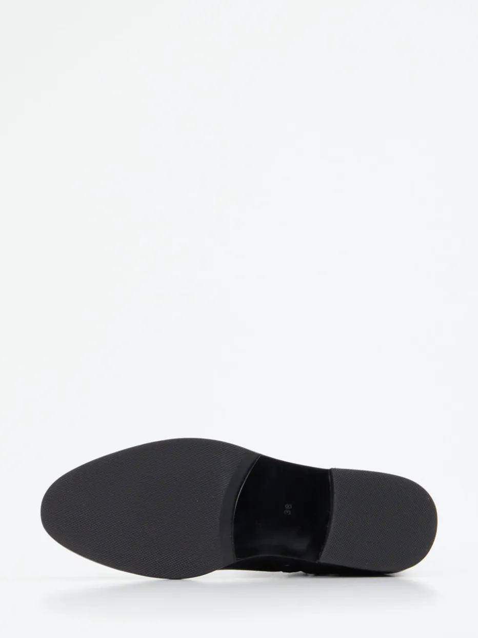 Schlicht im Stil, stark im Ausdruck.Die Marke Vivian Ray präsentiert eine elegante Damen-Stiefelette für Herbst und Winter. Durch ihre klare Linie und dezente Details fügt sich dieses Modell nahtlos in klassische wie moderne Looks ein. Der matt-glänzende Glattleder-Schaft in Tiefschwarz wird von einem dekorativen Riemen mit schwarzer Metallschnalle akzentuiert. Ein seitlicher Reißverschluss erleichtert das An- und Ausziehen. Gummisohle und flacher 3-cm-Absatz bieten Komfort für Büro- und Alltagssituationen. Die knöchelhohe Form und minimalistischen Nähte greifen den Quiet-Luxury-Trend auf und passen zu Hosen wie Röcken. Ein zurückhaltendes Statement moderner Schuhmode – stilvoll, vielseitig, Vivian Ray.