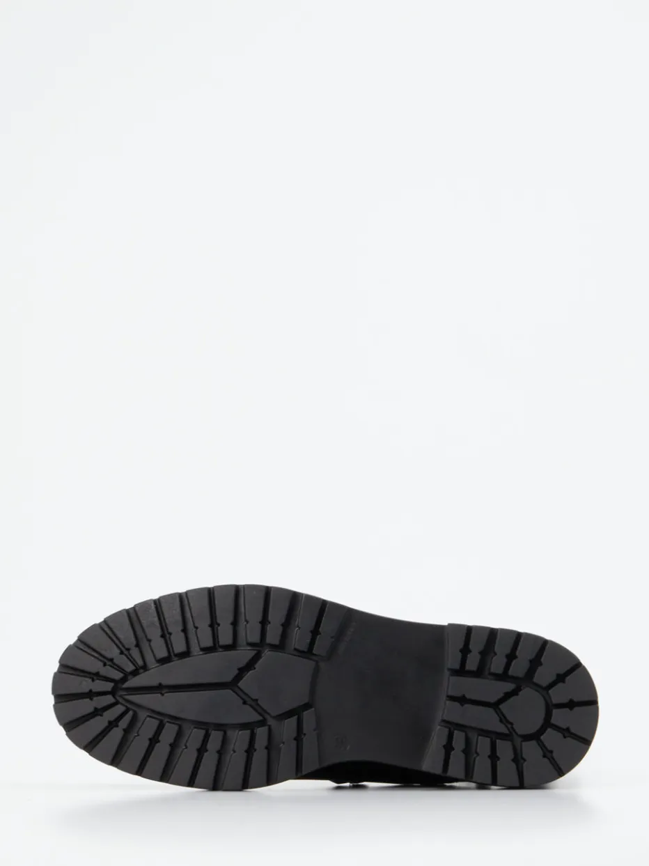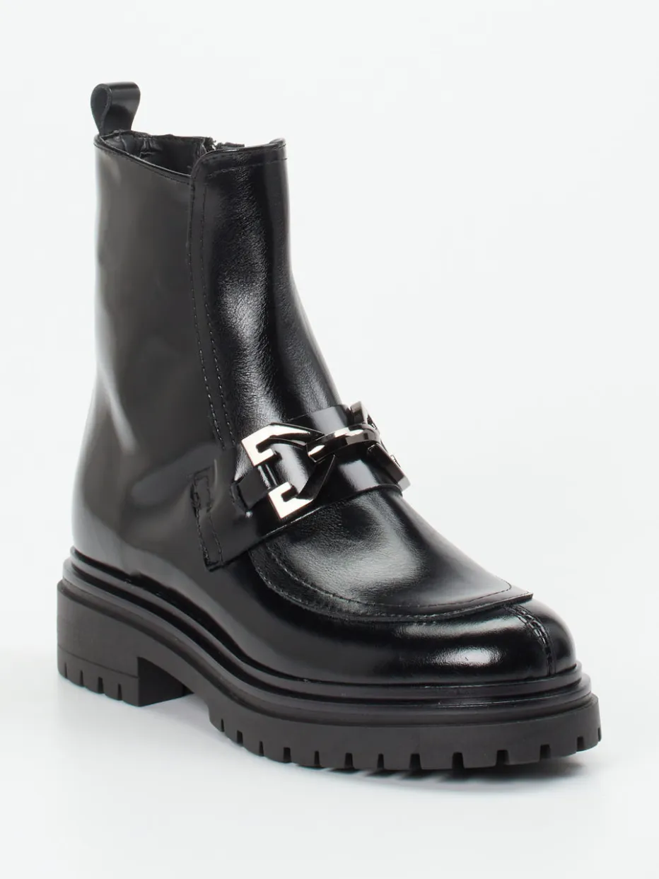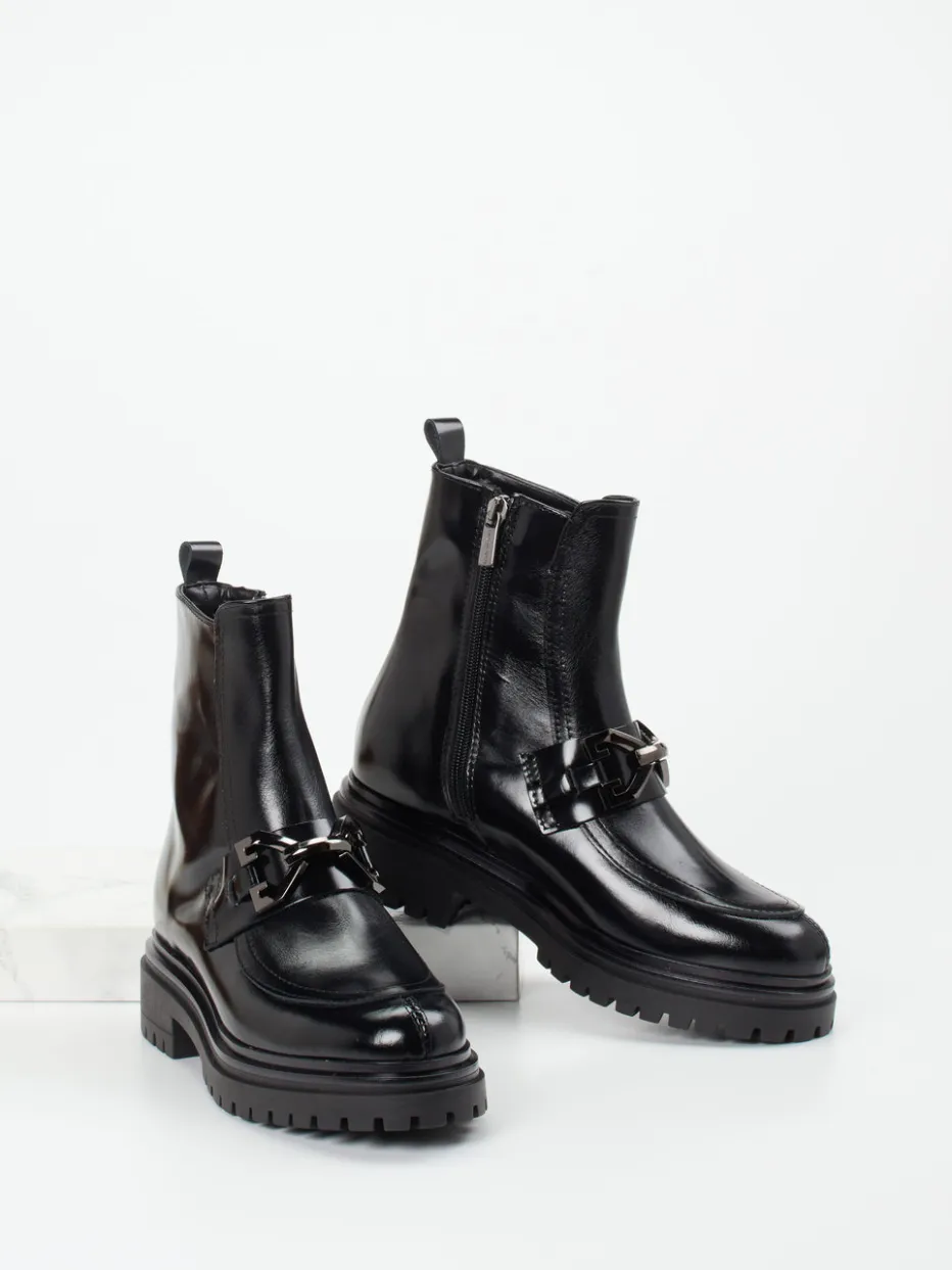 Diese Stiefelette kombiniert glänzendes Lackleder mit einer robusten Profilsohle – perfekt für stilvolle Auftritte mit urbanem Charakter.