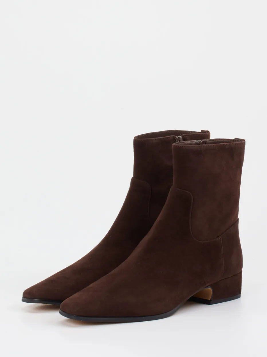 Ob im Office oder bei urbanen Spaziergängen – das Modell überzeugt mit hochwertigen Materialien und subtiler Ausstrahlung. Gefertigt aus Kalbleder mit samtiger Veloursoptik, zeigt sich der Schuh in einem tiefen Dunkelbraun. Die Form ist schlank gehalten, mit leicht spitz zulaufender Silhouette und flachem Blockabsatz. Ein seitlicher Innenreißverschluss sorgt für Komfort, während die Gummisohle rutschhemmenden Halt gibt. Stilistisch passt der Look zur ruhigen Eleganz des „Quiet Luxury“-Trends und lässt sich ideal mit Kaschmirmantel oder Lederaccessoires kombinieren.