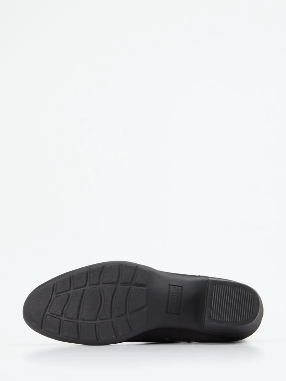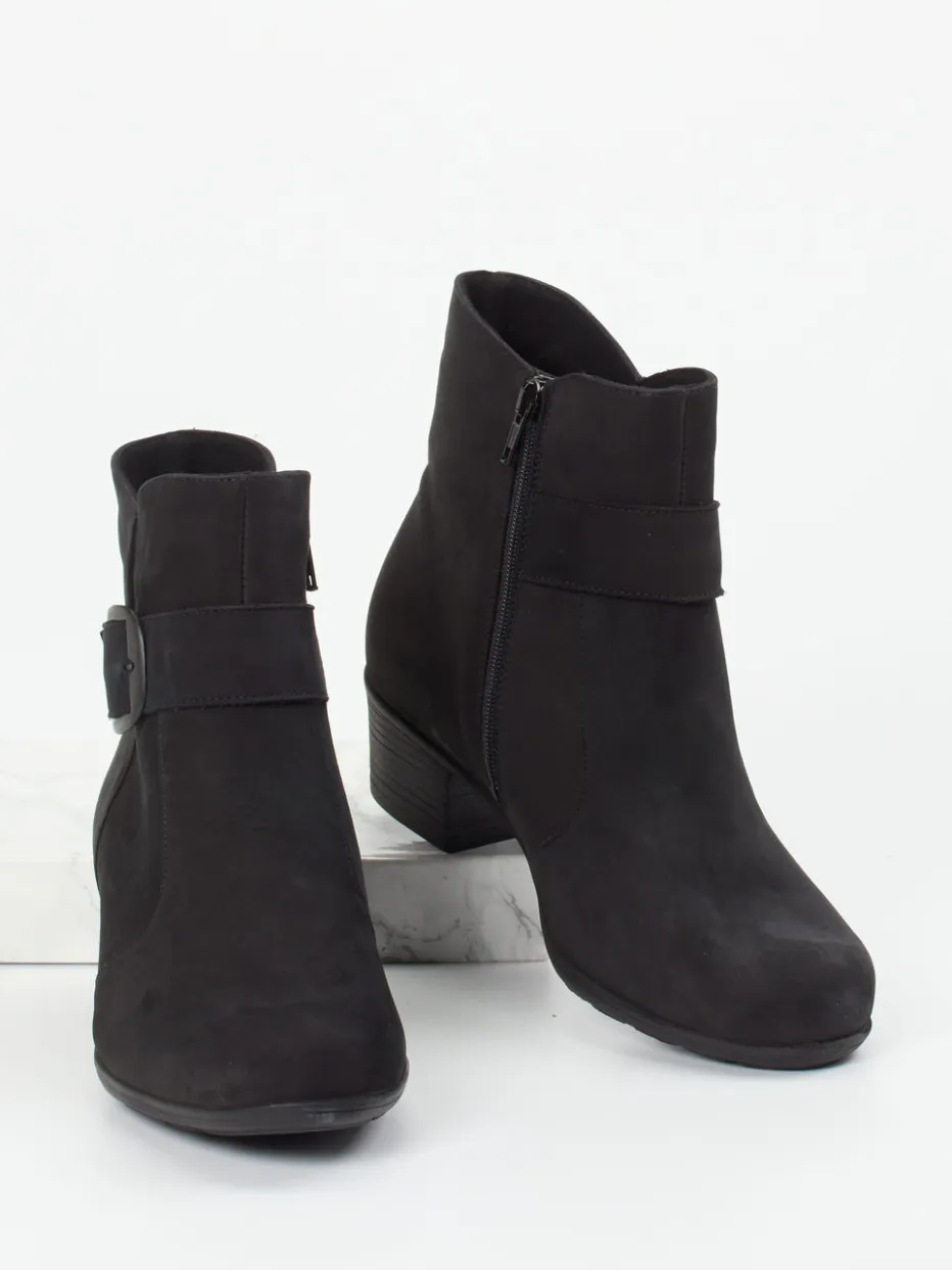 Dezente Details, maximaler Komfort.Solidus präsentiert mit dieser Stiefelette ein Modell, das durch reduzierte Linien und hochwertige Materialien überzeugt. Ideal für den Übergang im Büroalltag oder leger kombiniert in der Freizeit: Das schwarze Nubukleder ist samtig angeschliffen und erhält durch tonige Overlays sowie eine dekorative Schnalle eine subtile Struktur. Die klassische, knöchelhohe Form wird durch einen komfortablen Blockabsatz ergänzt. Der seitliche Reißverschluss erleichtert den Einstieg, während die profilierte Gummisohle Trittsicherheit bietet. Das textile Innenfutter aus Baumwolle sorgt für ein angenehmes Fußklima. Styling-Tipp: Funktioniert ideal zu dunklen Strumpfhosen und minimalistischen Outfits. Solidus steht hier für bequeme Eleganz in langlebiger Verarbeitung.