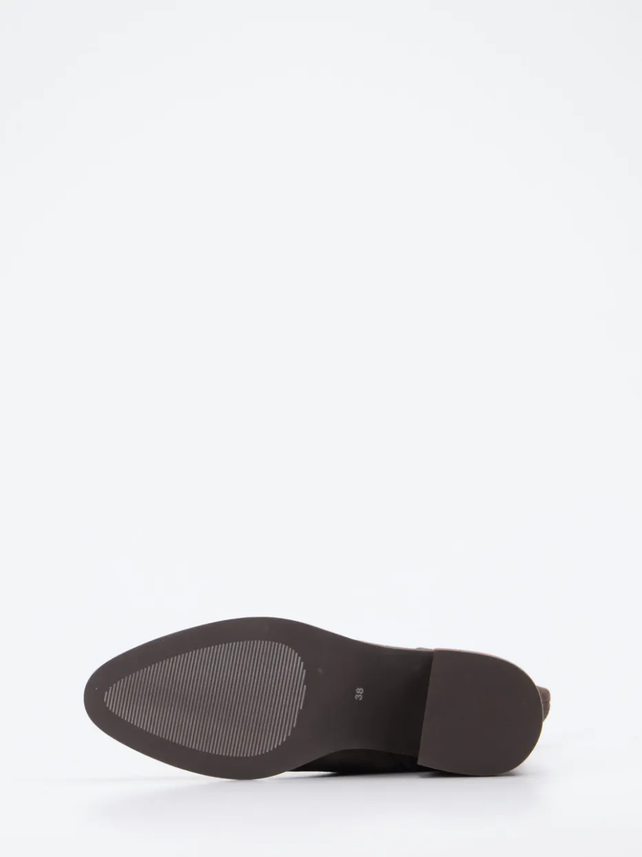 Understatement in eleganter Form. Gioia präsentiert eine klassische Damen-Stiefelette mit klarer Linie und feiner Oberfläche. Für Büro, Alltag oder stilvolle Freizeitmomente: Das Modell aus samtigem Veloursleder überzeugt durch seine tiefbraune Farbgebung, den geradlinigen Schaft und einen 6 cm hohen Blockabsatz in realistischer Holzoptik. Die glatte, matte Textur unterstreicht den betont minimalistischen Charakter, während ein rückseitiger Reißverschluss für komfortables Anziehen sorgt. Die hochwertige Kunststoffsohle rundet das Design funktional ab. Ästhetisch passend zur „Quiet Luxury“-Tonalität der Saison. Optimal zu Wollröcken oder hellen Kaschmirmänteln. Ein femininer Allrounder mit puristischer Eleganz von Gioia.