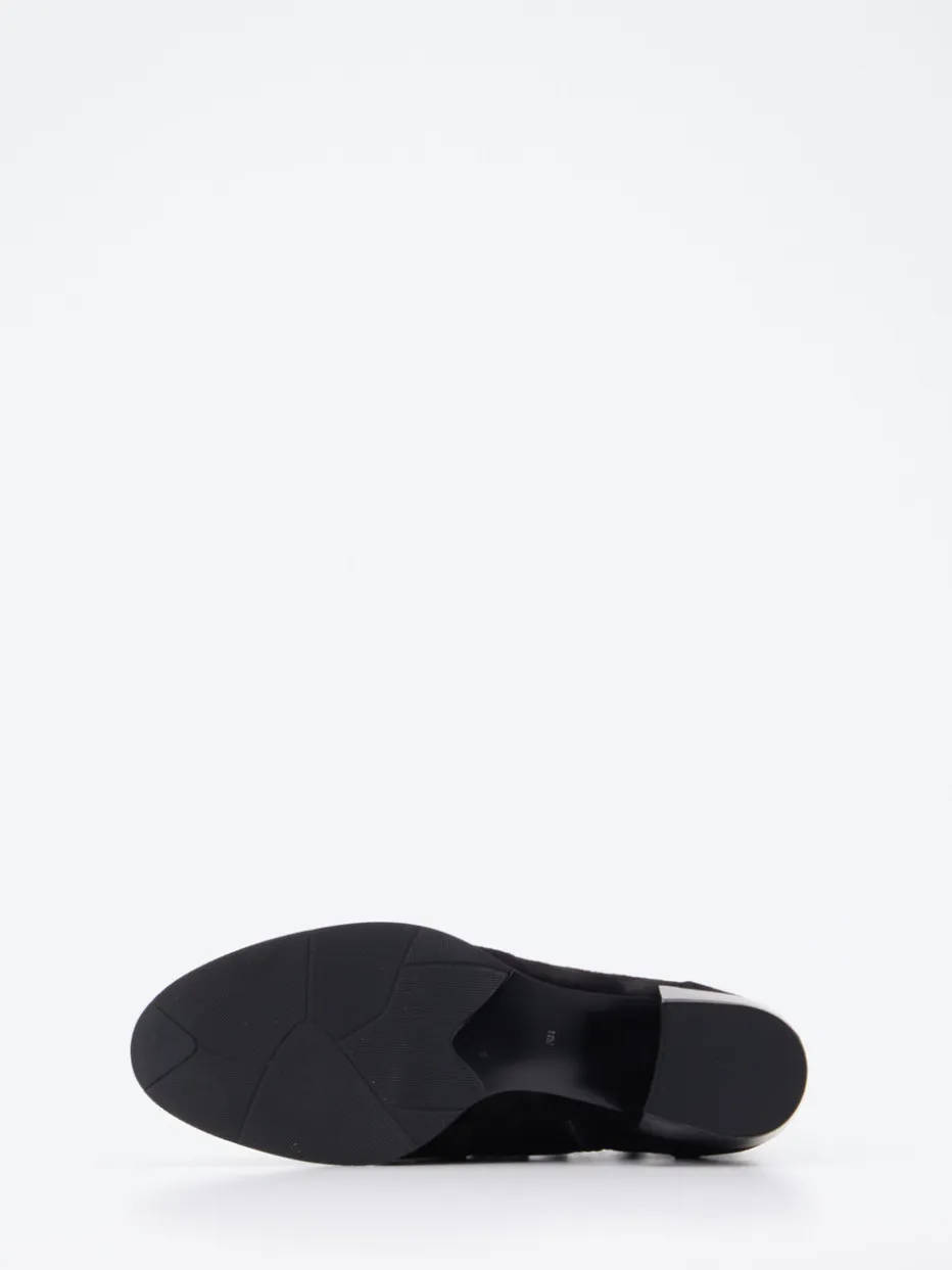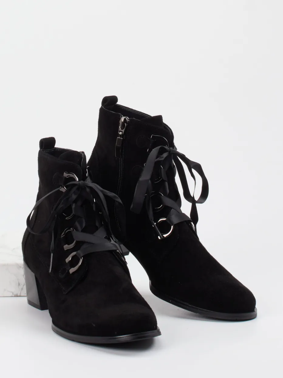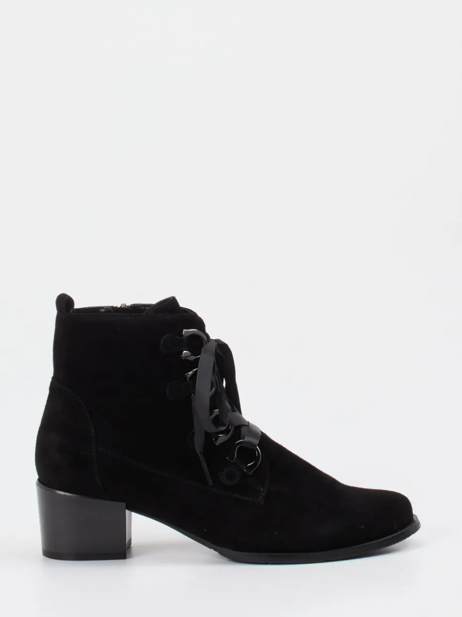 Die Stiefelette von Ralph Harrison verbindet klare Linien mit femininer Note. Ob Stadtspaziergang oder Abendessen, das weiche schwarze Veloursleder – samtig angeschliffen – sorgt für eleganten Komfort. Die Kombination aus Satin-Schnürung, silberfarbenen D-Ring-Ösen und seitlichem Reißverschluss setzt markante Akzente. Ein mittelhoher Blockabsatz sowie ein dunkelgraues Microfaserfutter unterstreichen den Qualitätsanspruch. Die knöchelhohe, leicht spitz zulaufende Form orientiert sich am minimalistischen Vintage-Revival aktueller Herbsttrends. Ideal zu Wollmantel oder Lederjacke.