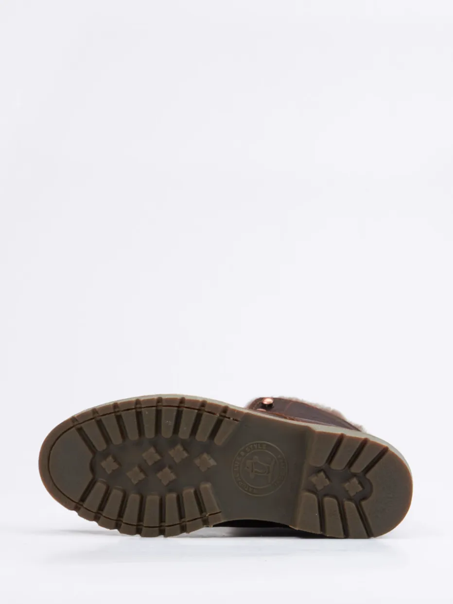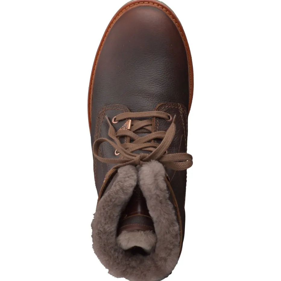 Wärmender Komfort für kalte Wintertage.Panama Jack überzeugt mit diesen gefütterten Schnürboots in der Kategorie Stiefeletten. Wenn urbaner Alltag auf winterliche Bedingungen trifft, sorgt dieses Modell für zuverlässigen Schutz und Komfort. Das braune Fettleder ist wetterfest verarbeitet und zeigt eine genarbte Oberfläche mit kupferfarbenen Ösen und markanter Kontrastnaht. Warmes Lammfellfutter schützt vor Kälte, eine profilierte Gummisohle gibt Trittsicherheit. Die klassische, knöchelhohe Form orientiert sich an Workwear-Designs mit hochwertigem Heritage-Charakter. Ideal für lässige Looks mit Thermohose oder Jeans. Panama Jack verbindet Funktionalität mit langlebigem Stilbewusstsein.