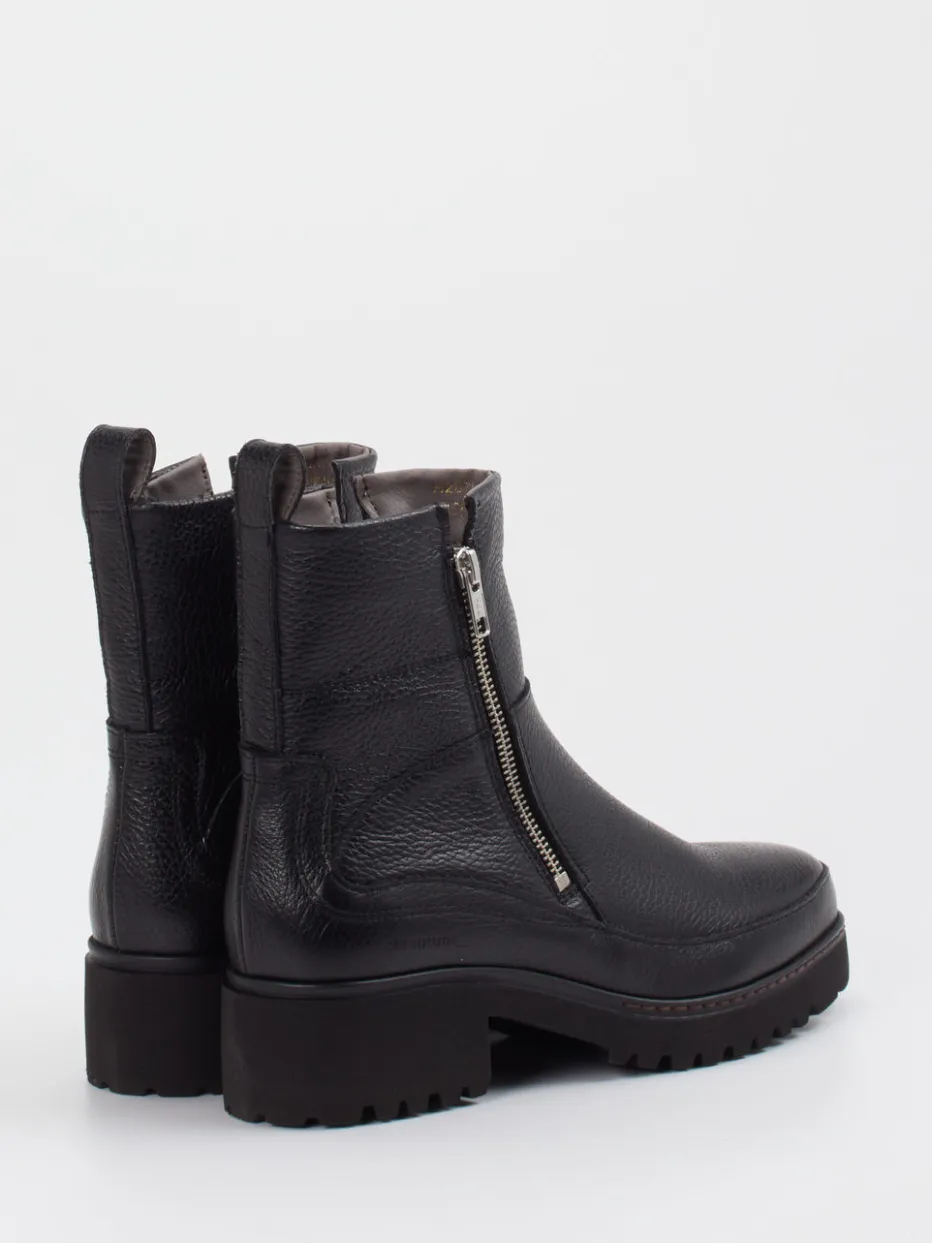 Diese schwarze Kalbleder-Stiefelette überzeugt durch ihre robuste Profilsohle, dezente Steppungen und funktionale Reißverschlüsse – ideal für stilvolle Herbsttage.