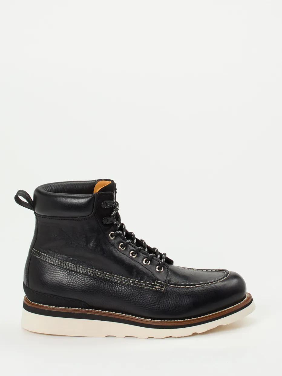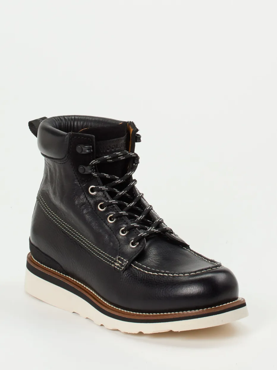 Stilvoll durch jedes Terrain.Woolrich liefert mit diesen Stiefeletten eine überzeugende Verbindung aus Handwerk und Funktion. Wenn Wetter und Wege herausfordern, bietet das vollständig ledergefütterte Modell aus schwarzem, genarbtem Kalbleder sicheren Halt und wärmenden Komfort. Die klassische, robuste Silhouette wirkt durch helle Kontrastnähte und die zweifarbige Vibram-Profilsohle markant und modern. Metallösen, Reflektorschnürung und Zugschlaufe unterstreichen den durchdachten Aufbau für outdoororientierte Looks. Stilistisch bewegt sich der Schuh zwischen Heritage Americana und Gorpcore – passend zur aktuellen Functional-Footwear-Tendenz. Kombiniert mit Thermo-Jeans und Outdoorjacke entsteht ein lässiger, zugleich praktischer Gesamtauftritt. Zuverlässiger Begleiter im urbanen wie ländlichen Alltag mit funktionalem Anspruch und authentischem Look.
