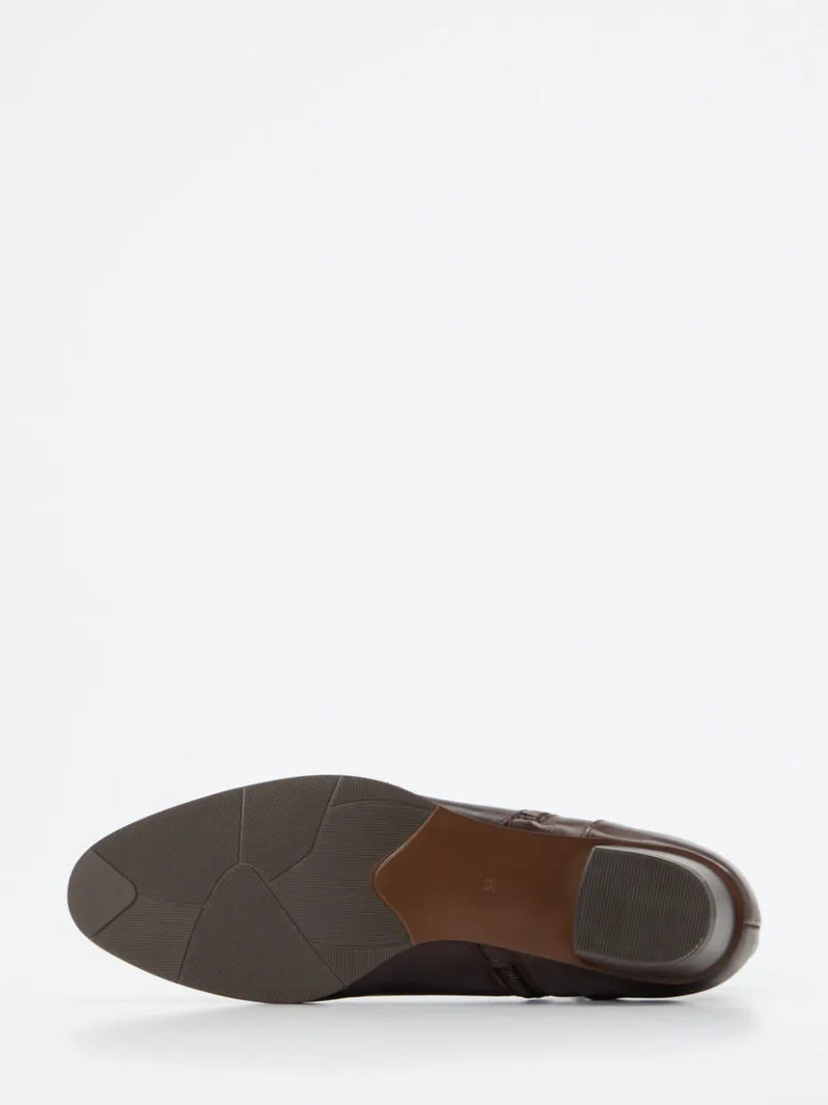 Klassik trifft auf subtilen Glamour.Die Marke Ralph Harrison präsentiert stilvolle Damen-Stiefeletten für den Herbst/Winter. Ideal für lange Tage im Büro oder den Cityalltag: Das fein glänzende Lammleder in Dunkelbraun verleiht der klassischen, knöchelhohen Silhouette einen hochwertigen Charakter. Beidseitige goldfarbene Reißverschlüsse setzen elegante Akzente und ermöglichen einen komfortablen Einstieg. Die profilierte Gummisohle und der 3 cm hohe Blockabsatz sorgen für sicheren Stand und anhaltenden Tragekomfort. Dezente Designelemente wie eine seitliche Lasche ergänzen den minimalistischen Look im Geist von „Quiet Luxury“. Kombiniert mit Wollmantel oder Lederbag ideal für urbane Styles. Ein vielseitiger Begleiter mit femininer Ästhetik und subtiler Eleganz.