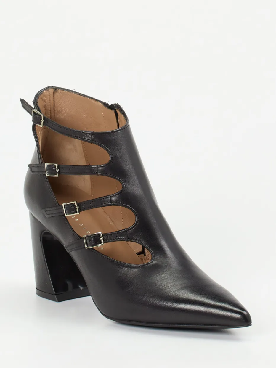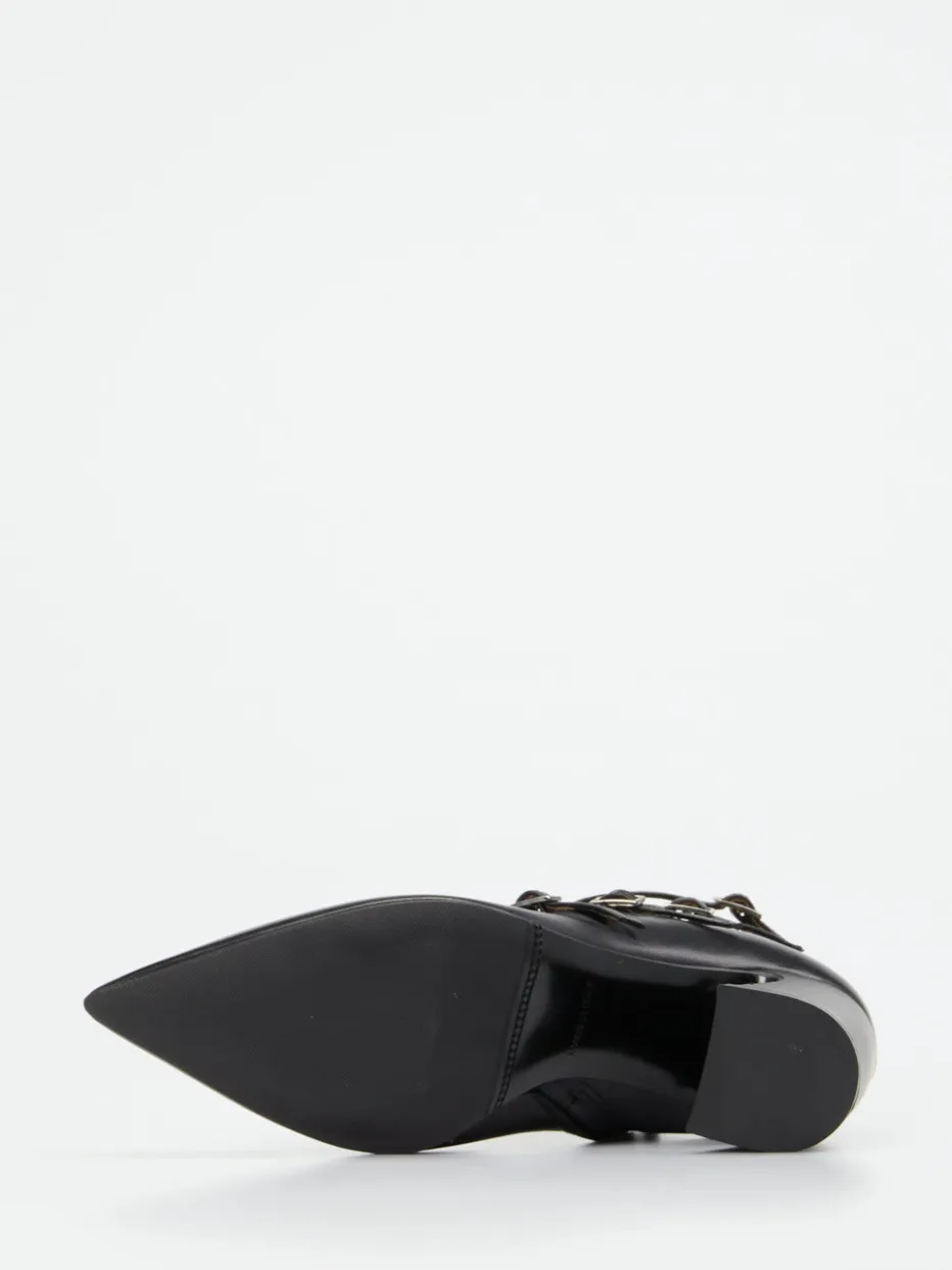 Diese Cut-Out-Stiefelette verbindet weiches Lammleder mit glänzender Oberfläche und markanten Silberschnallen zu einem urbanen Trend-Piece mit femininer Eleganz.