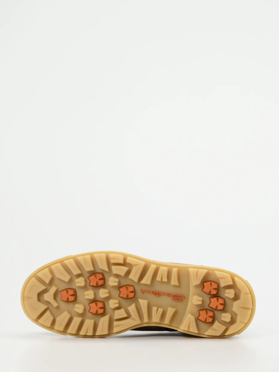 Gefüttert, griffig, gorpcoretauglich.Die Stiefeletten von Santoni vereinen hochwertige Materialien mit Outdoor-Ästhetik. Ideal für eisige Wintertage oder lange Spaziergänge auf wechselndem Untergrund: Das beige Nubukleder mit natürlicher Narbung ist schmutz- und wasserabweisend und trifft auf rustikale Glattleder-Patches. Die kräftige Schnürung mit Metallösen und dreifarbigen Bändern greift gekonnt den Gorpcore-Trend auf. Innen hält ein Lammfellfutter wohlig warm, während die stark profilierte Gummisohle in Honigton zuverlässigen Halt bietet. Der seitliche Reißverschluss erleichtert den Einstieg. Funktion und modischer Anspruch auf höchstem Niveau – typisch Santoni.