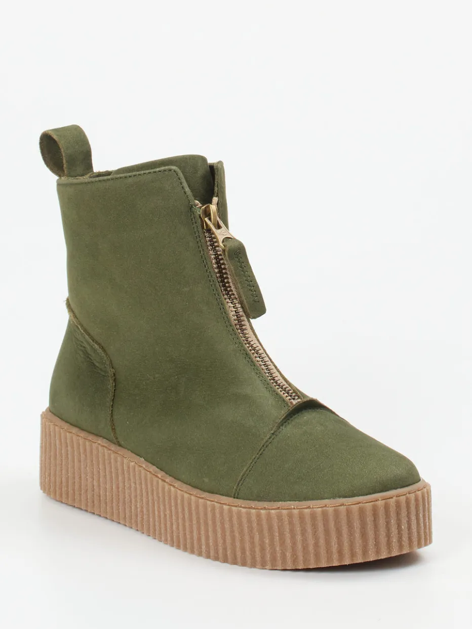 Ideal für urbane Abenteuer oder entspannte Freizeitmomente verbindet diese knöchelhohe Silhouette markanten Look mit Komfort. Gefertigt aus Nubukleder mit samtiger Velourshaptik zeigt sich der Schuh in mattem Olivgrün – modern und zeitlos. Reißverschluss in Goldoptik, Zuglasche und tonal abgestimmte Nähte ergänzen das funktionale Design. Die profilierte Gummisohle sorgt für Trittsicherheit, während das Innenfutter aus Leder angenehmen Tragekomfort bietet. Streetwear-inspirierter Stil trifft auf Alltagstauglichkeit.