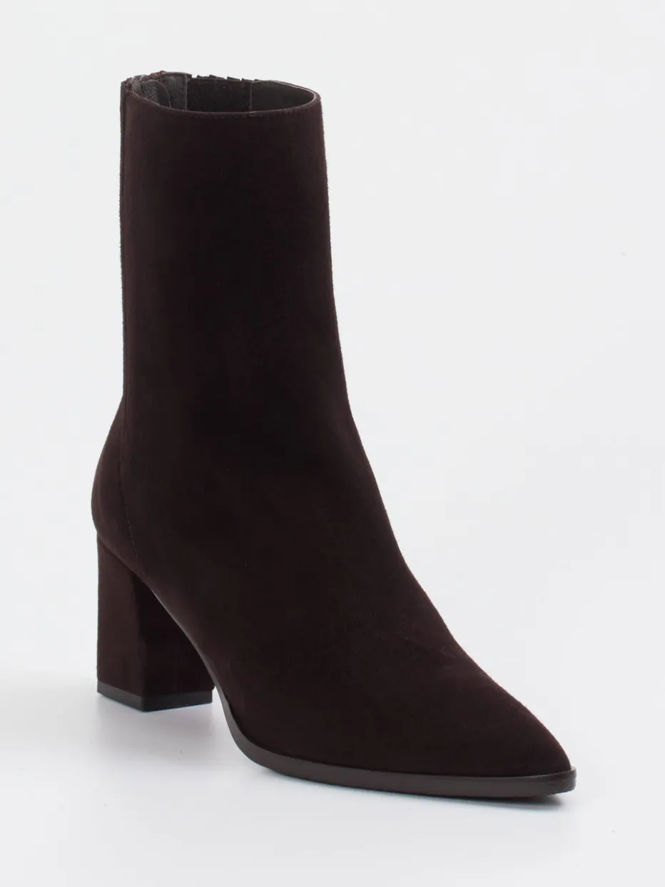 Der dunkle Veloursleder-Look, der markante Blockabsatz und die spitze Form verbinden bei diesem Modell gekonnt elegante Zurückhaltung mit modernem Minimalismus.