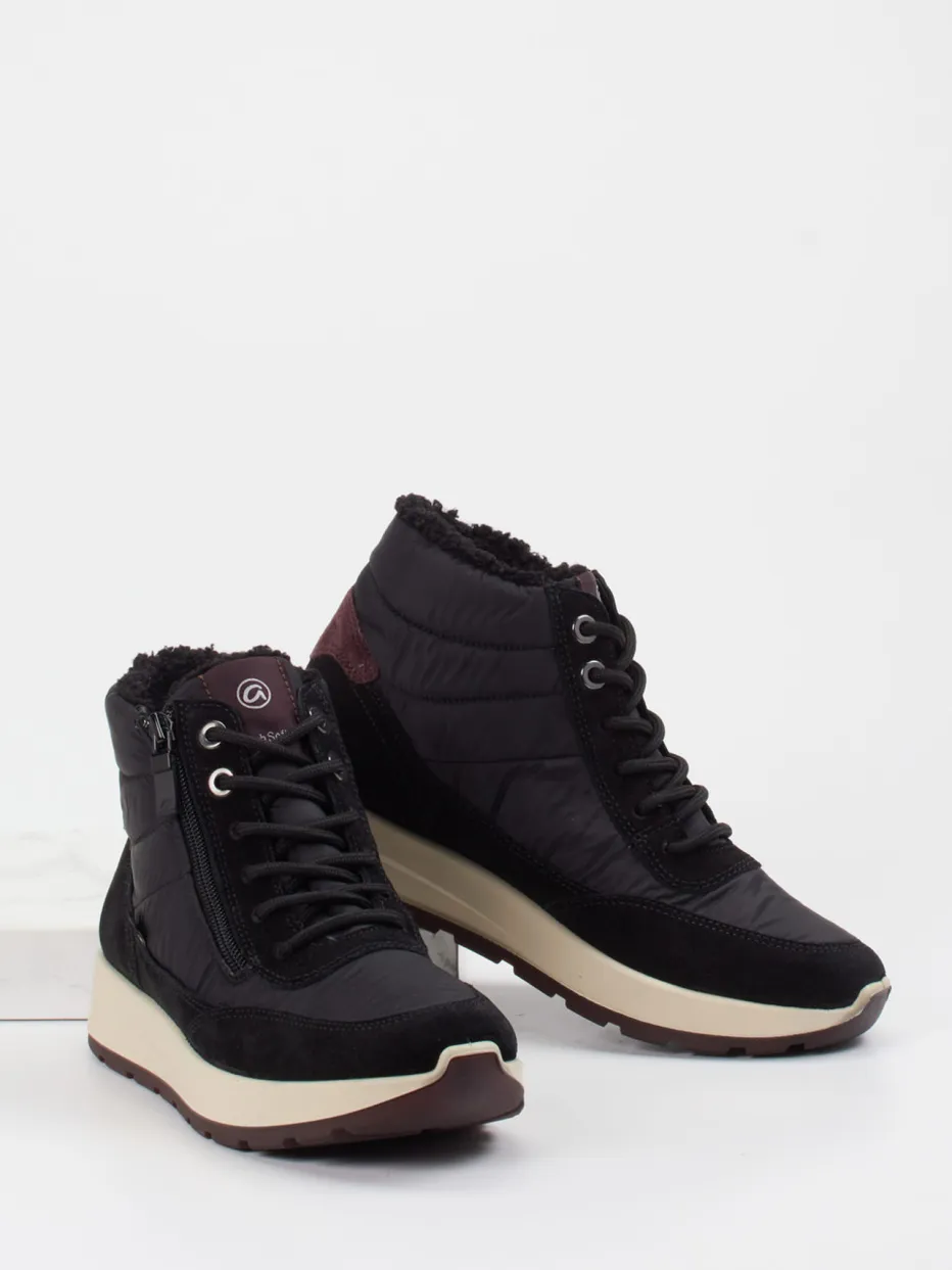 Durch wind- und wasserdichtes Material, ergänzt um samtiges Veloursleder und gestepptes Textil, bleibt der Fuß angenehm trocken und warm. Die schwarze Farbgebung wird durch bordeauxrote Akzente dezent unterbrochen, während die knöchelhohe, kompakte Silhouette funktional und modisch wirkt. Reißverschluss und Schnürung sorgen für guten Halt, die griffige Gummisohle bietet Traktion auf rutschigen Untergründen. Das warme Innenfutter aus Kunstfell schützt selbst an frostigen Tagen. Ideal für Alltagslooks oder winterliche Outdoor-Aktivitäten mit komfortbetontem Anspruch.