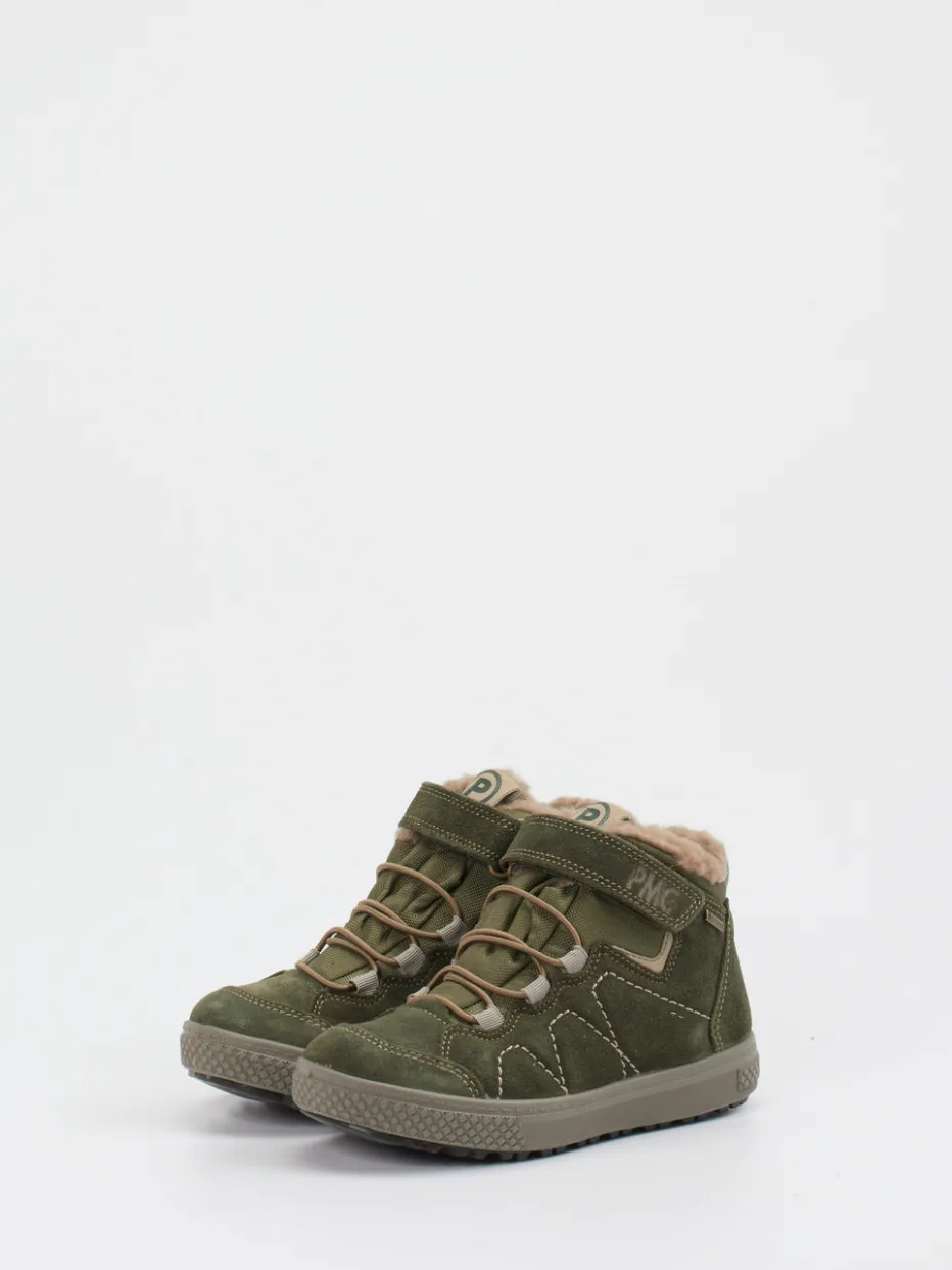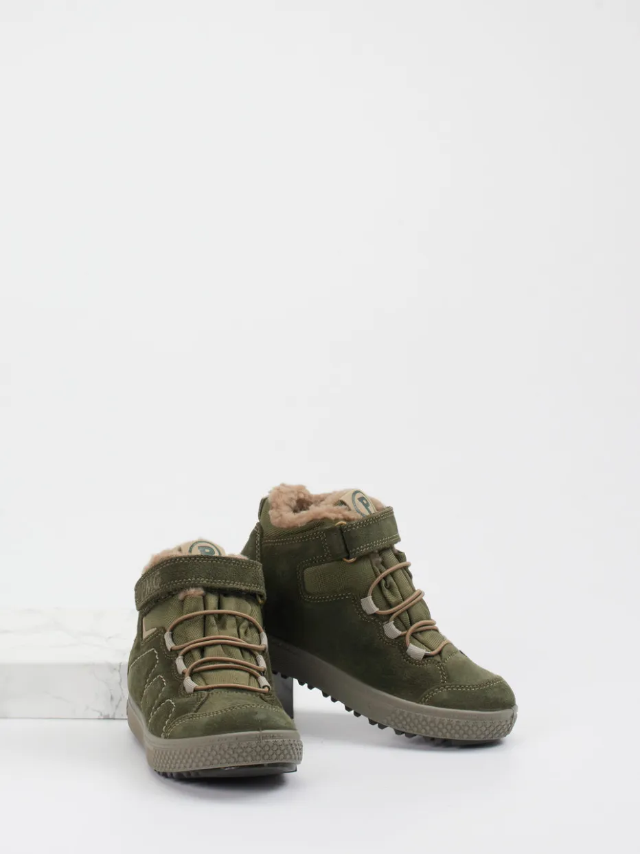Wärme und Halt für kleine Entdecker.Primigi präsentiert praktische Stiefeletten für Kinder mit hochwertigen Outdooreigenschaften. Ob auf dem Schulweg oder beim Toben im Wald – die gefütterten Boots aus Veloursleder zeigen sich strapazierfähig und komfortabel zugleich. Das matte Obermaterial erhält durch Kontrastnähte und eine Logo-Stickerei auf dem Klettverschluss einen sportlichen Akzent. Dank Warmfutter und rutschfester Gummisohle sind sie wie gemacht für kalte, nasse Tage. Der olivgrüne Ton fügt sich vielseitig in Freizeit- und Outdoor-Outfits ein. Ein Modell, das funktionale Wetterfestigkeit und kindgerechtes Design stilvoll vereint.
