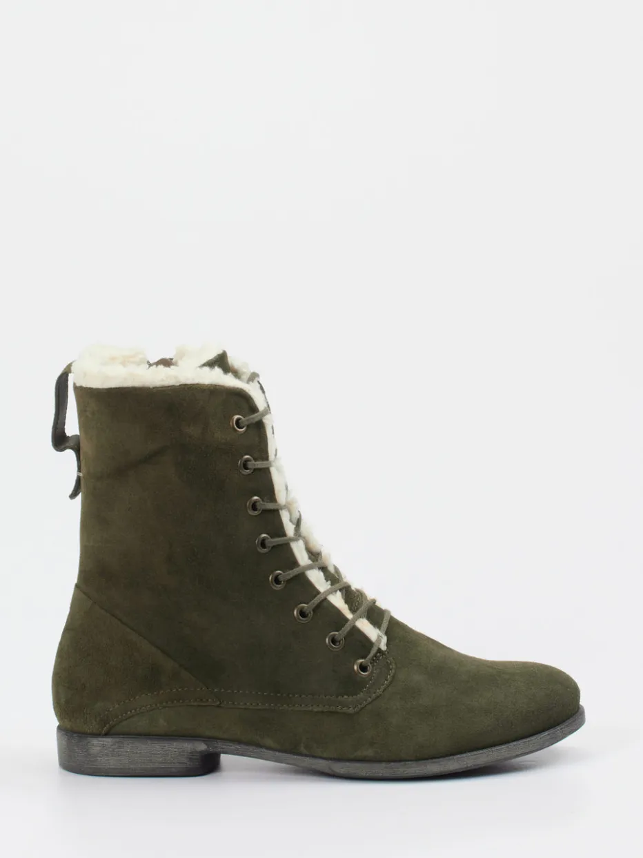 Wärme trifft Understatement.Die Marke Think präsentiert diese olivgrünen Stiefeletten für Damen. Wenn an frostigen Tagen Wärme und Stil zugleich gefragt sind, ist dieses Modell die passende Wahl. Gefertigt aus hochwertigem Veloursleder, samtig angeschliffen und in matter Oberfläche, bieten sie mit kunstfellgefüttertem Innenleben angenehmen Tragekomfort. Die Kombination aus Reißverschluss und Schnürung mit bronzefarbenen Ösen sorgt für eine bequeme Handhabung und einen klaren Look. Die schmale Silhouette, sichtbare Kontrastnähte und das griffige Sohlenprofil unterstreichen den dezenten Utility-Einfluss. Besonders harmonisch in Kombination mit Steppjacken oder Strickaccessoires. Think Komfort vereint mit herbsttauglicher Designsprache.