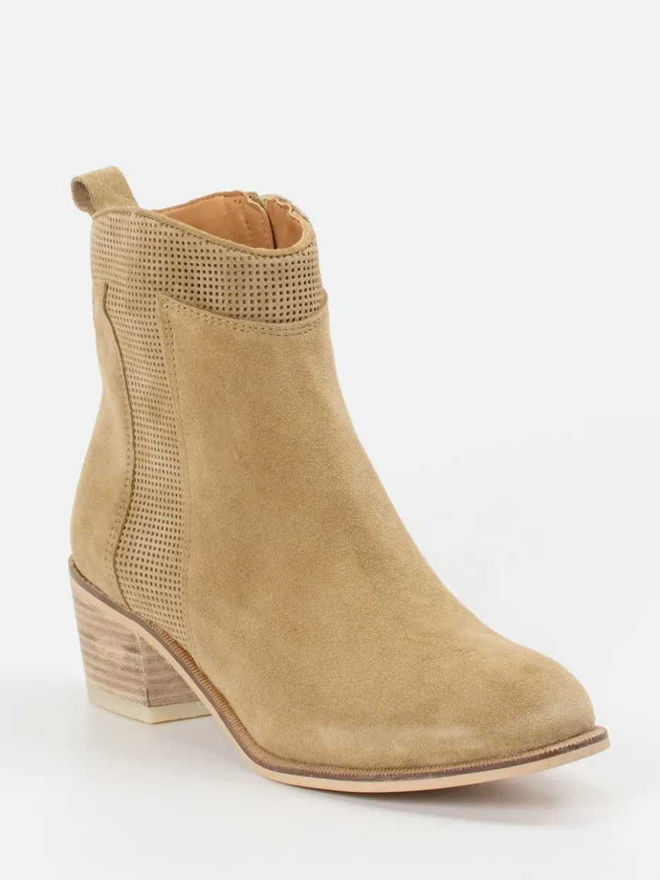 Das weiche Veloursleder, samtig angeschliffen und in einem natürlichen Sandbeige gehalten, steht im Fokus des minimalistischen Looks. Die perforierten Schaftdetails, ein goldfarbener Druckknopf sowie die strukturierten Blockabsätze sorgen für stilvolle Akzente und Alltagstauglichkeit. Seitlicher Zipper und rückseitige Zuglasche garantieren einfaches Anziehen. Als saisonales Highlight lassen sich die Stiefeletten im „Quiet Luxury“-Trend hervorragend zu natürlichen Erdtönen kombinieren.