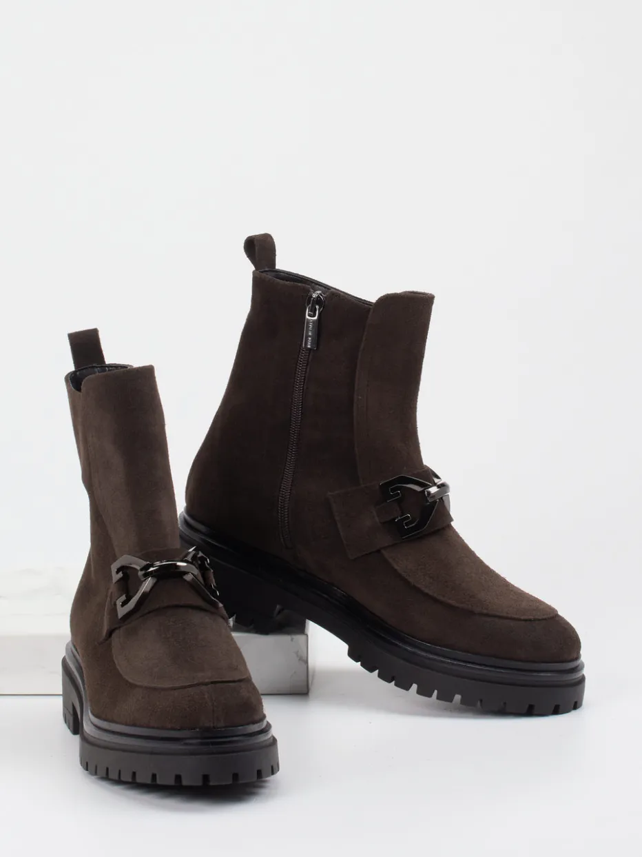 Minimalismus trifft Alltagstauglichkeit.Die Damen-Stiefeletten von Andrea Puccini interpretieren den aktuellen Chunky-Trend stilbewusst. Für urbane Herbsttage mit wechselhaftem Wetter bieten die dunkelbraunen Boots aus Veloursleder, samtig matt ausgeführt, zuverlässige Funktion und klaren Stil. Die klare, rund zulaufende Form reicht bis zum Knöchel, ein seitlicher Reißverschluss und eine Zuglasche erleichtern das Anziehen. Blickfang ist eine dunkel glänzende Metallspange, welche den minimalistischen Look akzentuiert. Die stark profilierte Gummisohle sorgt für Trittsicherheit bei gleichzeitiger optischer Präsenz. Inspiriert von Streetwear und Quiet Luxury, überzeugt das Modell im Büro wie auch in der City. Ein Kaschmirmantel ergänzt den Look edel. Unterstreicht souverän den Anspruch modebewusster Komfort-orientierter Styles.