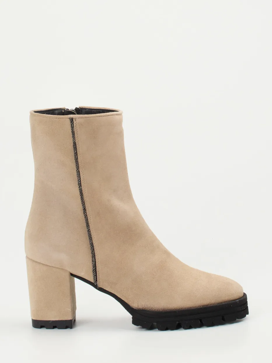 Minimalismus trifft urbane Funktion.Die Marke Konstantin Starke präsentiert eine Damen-Stiefelette mit modernem Charakter. Perfekt für kühlere Tage in der Stadt verbindet das Modell hellbeigefarbenes Veloursleder mit samtig-matter Oberfläche und einer markant profilierten Gummisohle. Die klare, gerade Form mit blockigem 7-cm-Absatz wirkt strukturiert, während feine Kontrastnähte und ein dezenter Reißverschluss in Schwarz das Design akzentuieren. Die weich gepolsterte Innensohle sorgt für zusätzlichen Komfort. Ein stilvoll zurückhaltendes Modell für Minimalismus-Liebhaberinnen – ideal zu Kaschmirmänteln oder Lederhandschuhen. Modern interpretierter Herbstschuh mit betontem Komfort-Finish.