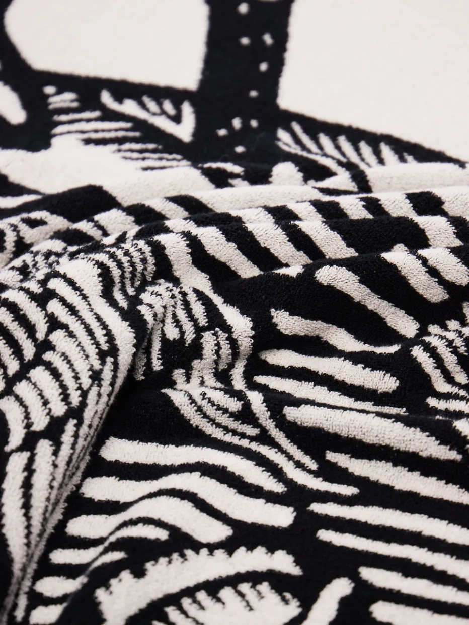 Flauschig-weich und künstlerisch gestaltet: Dieses großzügige Strandtuch kombiniert hochwertiges Baumwollfrottee mit einem kontrastreichen Schwarz-Weiß-Design in Jacquard-Webung.
