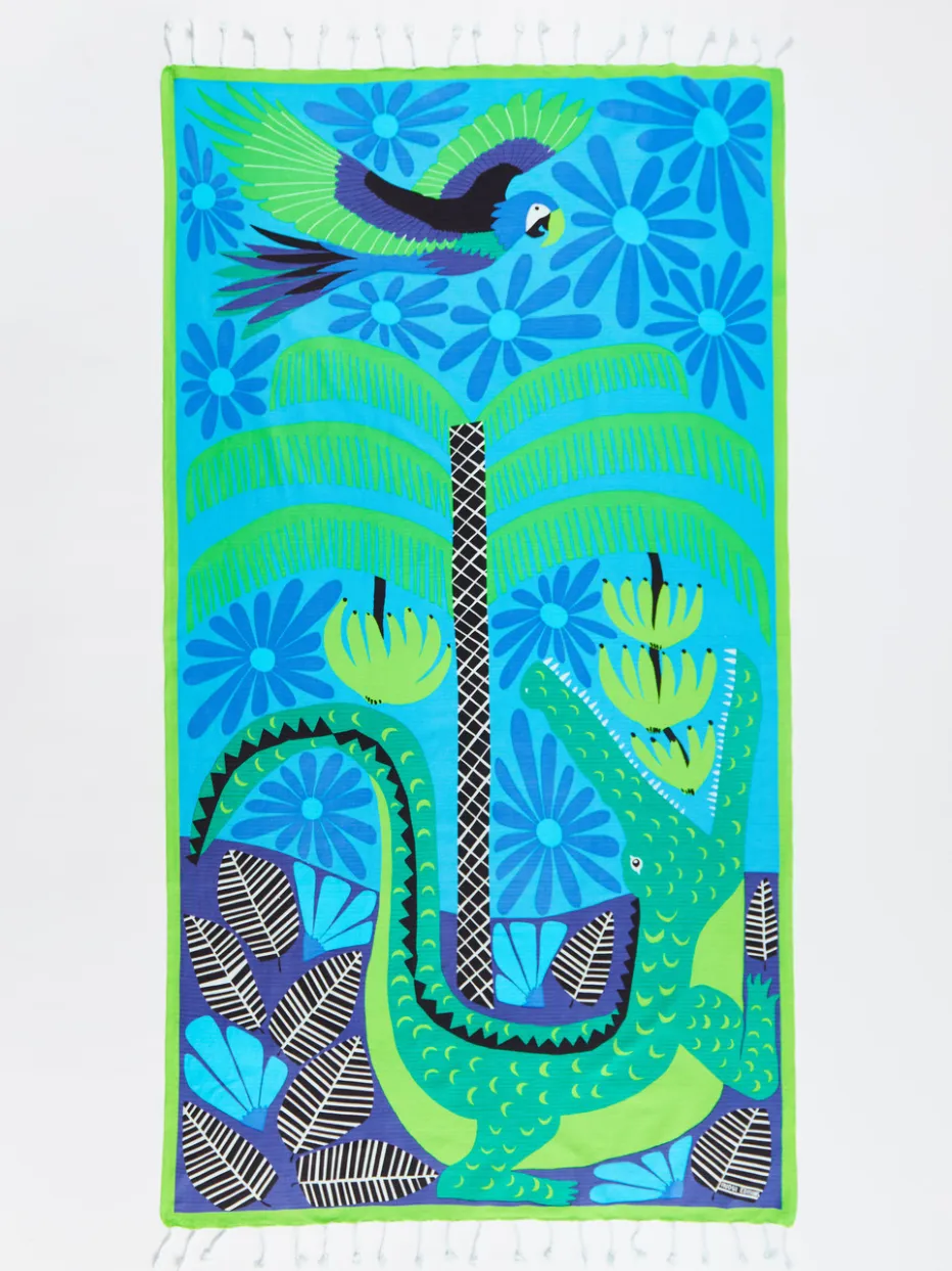 Ausdrucksstarkes Strandaccessoire in weich gewebter Baumwolle mit farbintensiver Tropengrafik – ideal für stilbewusste Sommertage.