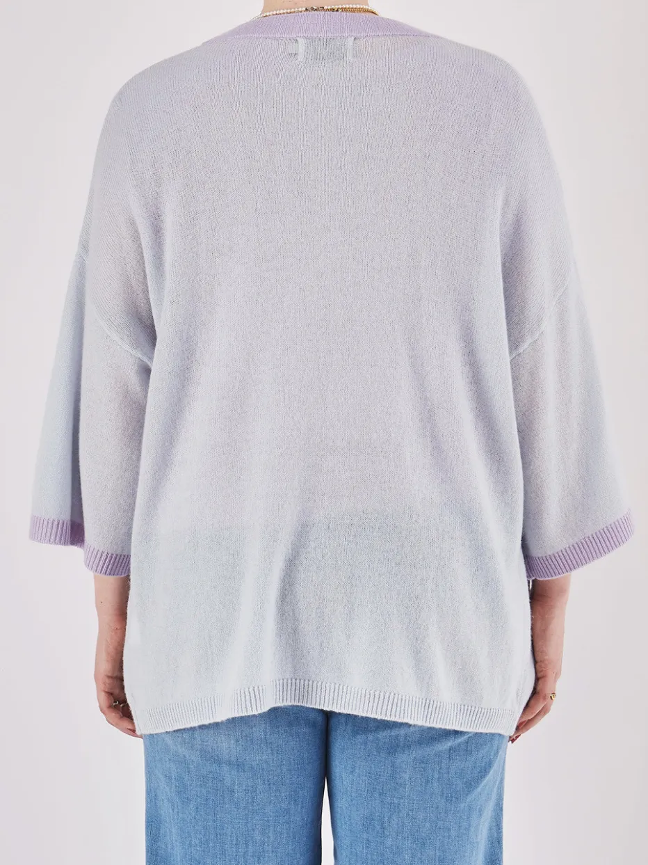 Die fliederfarbene Kaschmirstrickjacke von FLONA verbindet luxuriöse Weichheit mit einem modernen, kastigen Schnitt im Scandi-Stil.