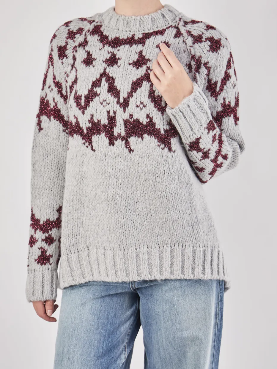 Der lockere Pullover von Yippie Hippie verbindet groben Strick mit glitzernden Details im Norwegermuster – eine stilvolle Wahl für gemütliche Stunden und moderne Winter-Looks.