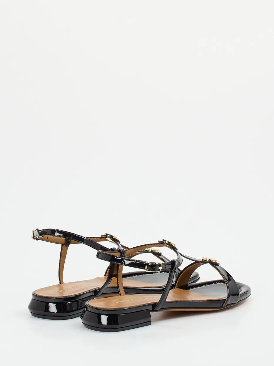 Diese Sandale vereint hochglänzendes Lackleder mit eleganten Goldakzenten – ein stilvolles Highlight im Zeichen des Quiet Luxury. Die flache Form und dezente Carré-Leiste runden das Design urban ab.